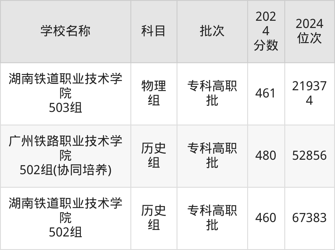 广东高考历史组共有2所铁路专科学校在460到480分之间录取,包含广州铁路职业技术学院、湖南铁道职业技术学院。