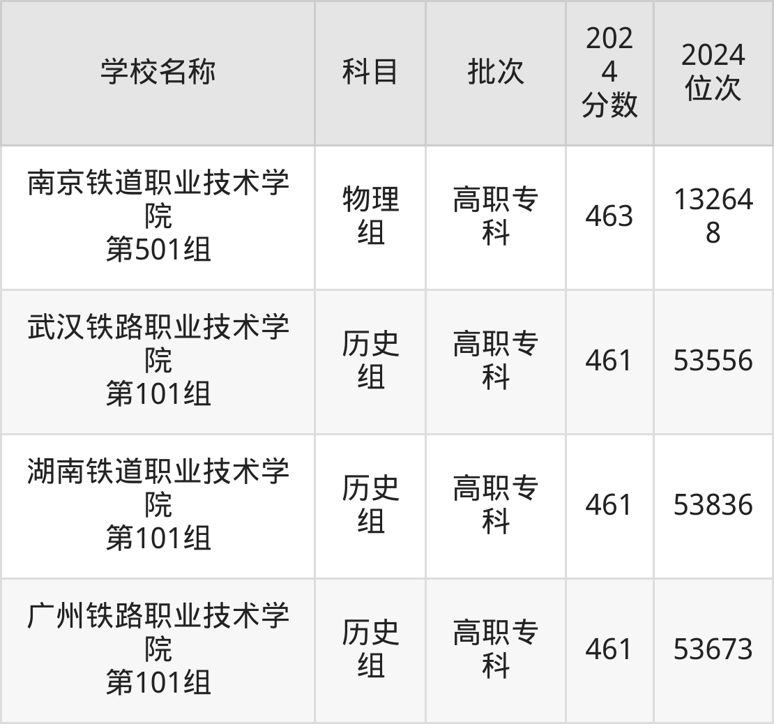 江西高考历史组共有3所铁路专科学校在460到480分之间录取,包含武汉铁路职业技术学院、湖南铁道职业技术学院、广州铁路职业技术学院。