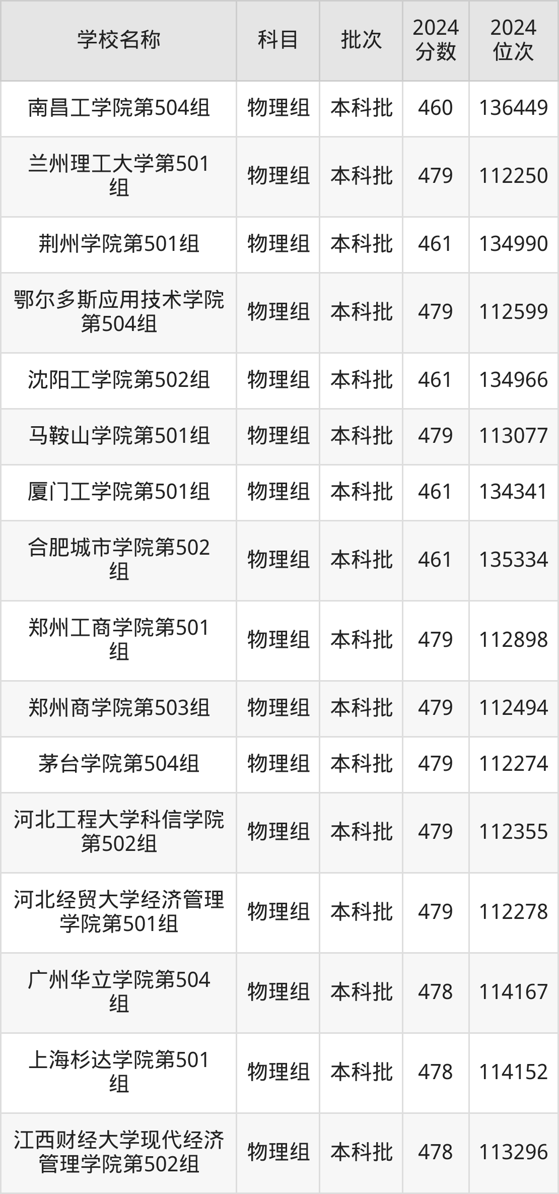 江西高考物理组共有115所理科大学在460到480分之间录取,包含广州商学院、河北工业职业技术大学、南京工业大学浦江学院、吉林工商学院、湖南工业大学科技学院、南华大学船山学院、湖南理工学院南湖学院、郑州财经学院、南京审计大学金审学院、南京航空航天大学金城学院。