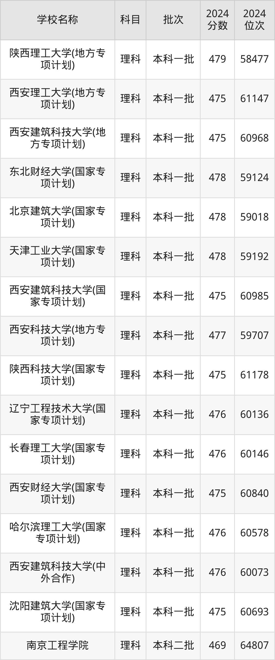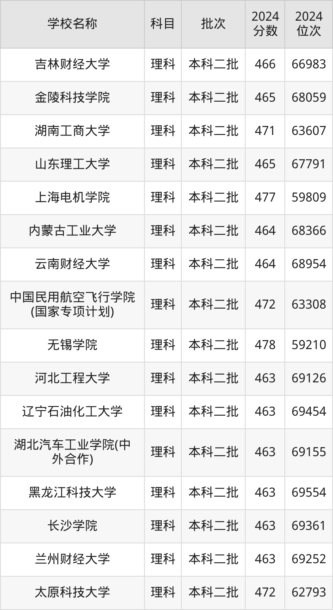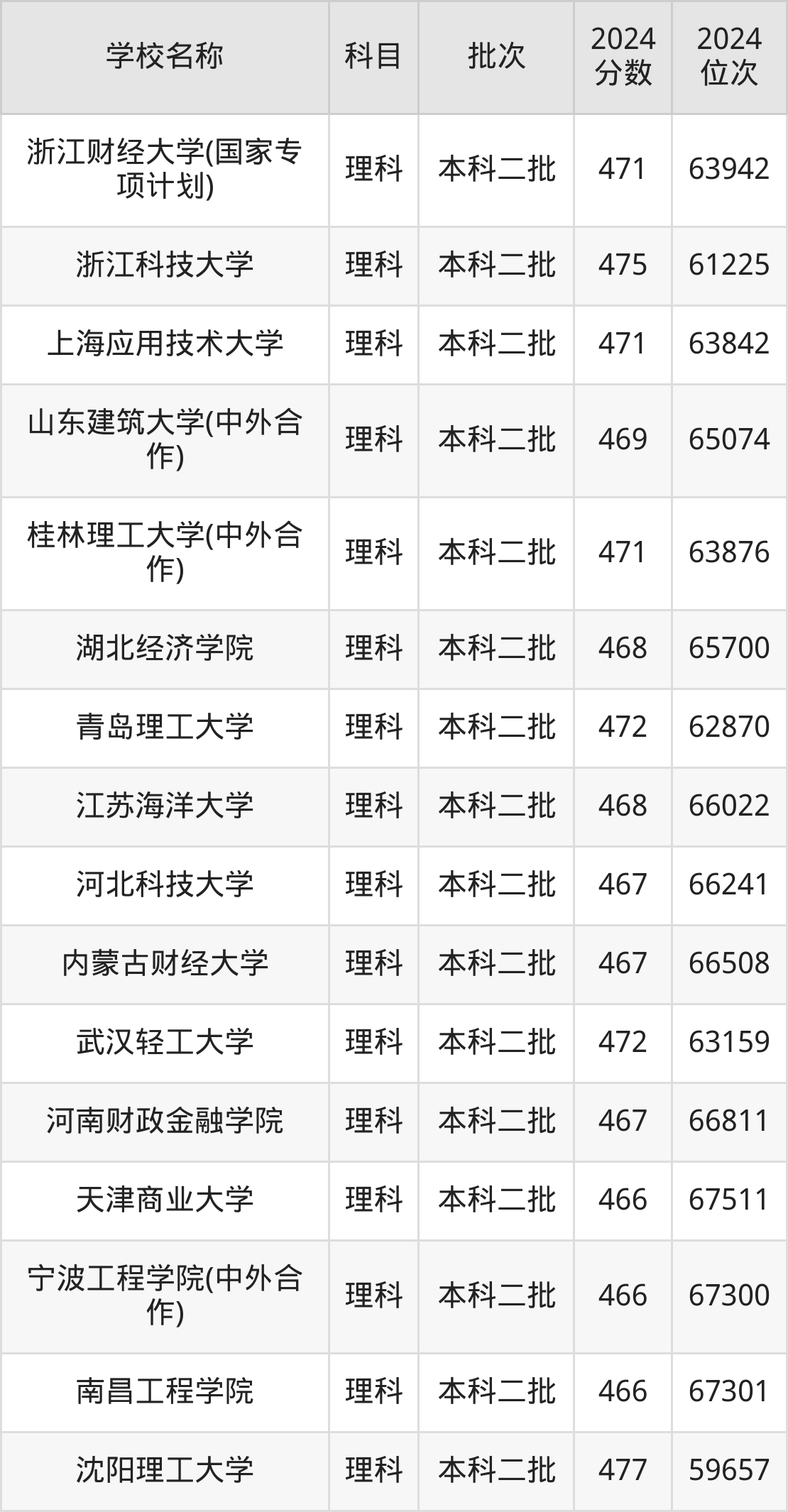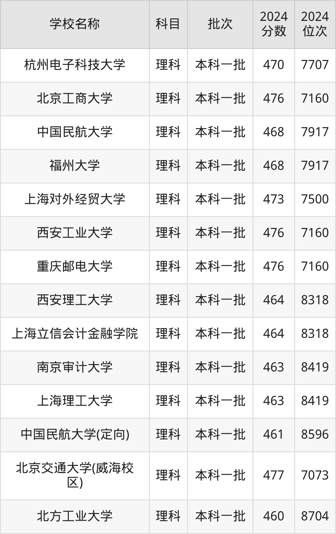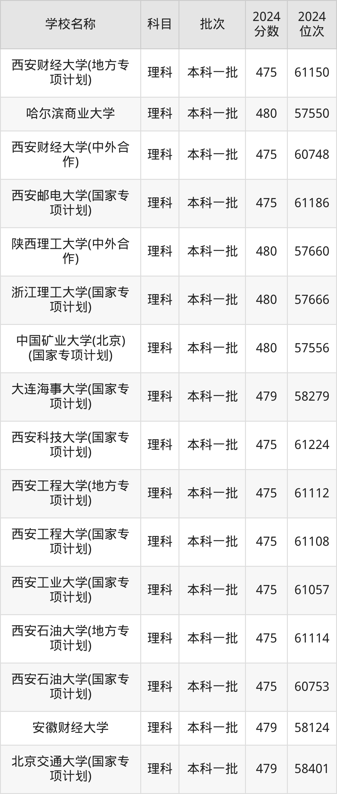 陕西高考理科共有105所理科大学在460到480分之间录取,包含浙江财经大学、哈尔滨商业大学、南昌航空大学、陕西理工大学(中外合作)、浙江理工大学(国家专项计划)、郑州轻工业大学(中外合作)、中国矿业大学(北京)(国家专项计划)、大连海事大学(国家专项计划)、安徽财经大学、北京交通大学(国家专项计划)。
