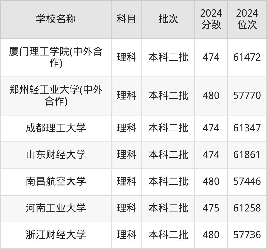 福建高考历史组共有40所理科大学在460到480分之间录取,包含河南财政金融学院、东北电力大学、防灾科技学院、厦门理工学院(国际课程项目)、赣南科技学院、福建商学院、洛阳理工学院、桂林旅游学院、荆楚理工学院、河北金融学院。