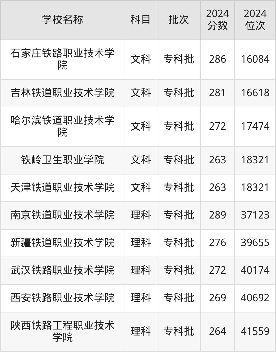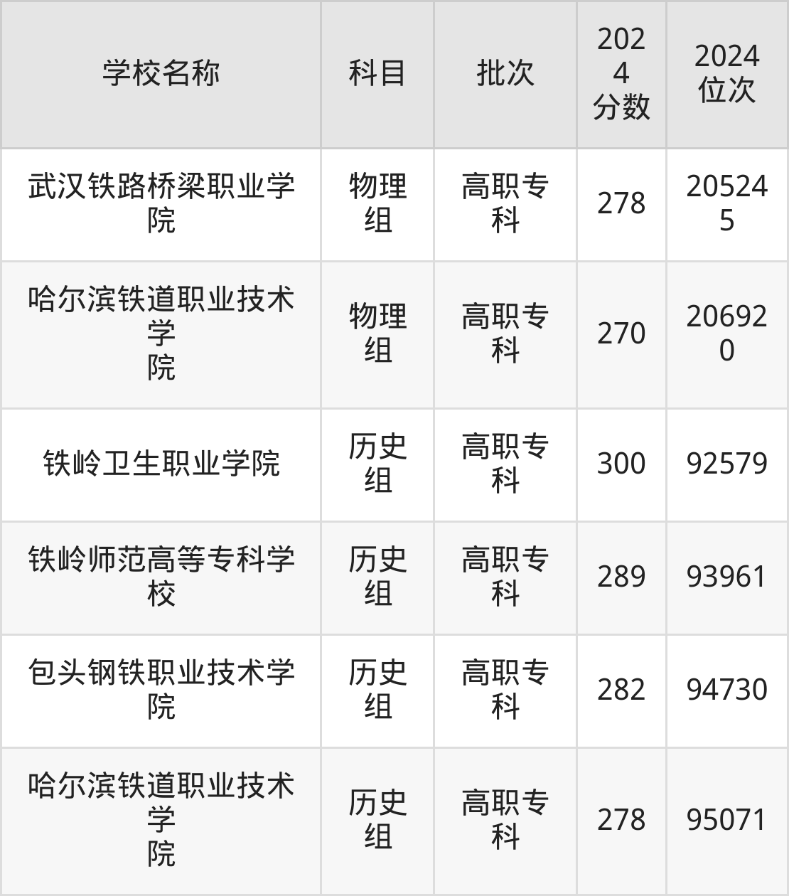 贵州高考历史组共有4所铁路专科学校在260到300分之间录取,包含铁岭卫生职业学院、铁岭师范高等专科学校、包头钢铁职业技术学院、哈尔滨铁道职业技术学院。