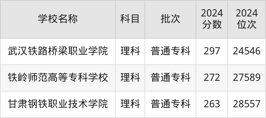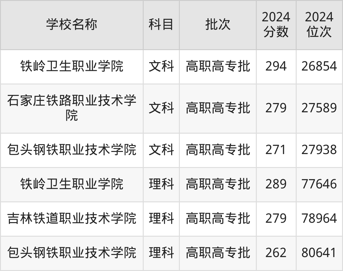 内蒙古高考理科共有3所铁路专科学校在260到300分之间录取,包含铁岭卫生职业学院、吉林铁道职业技术学院、包头钢铁职业技术学院。