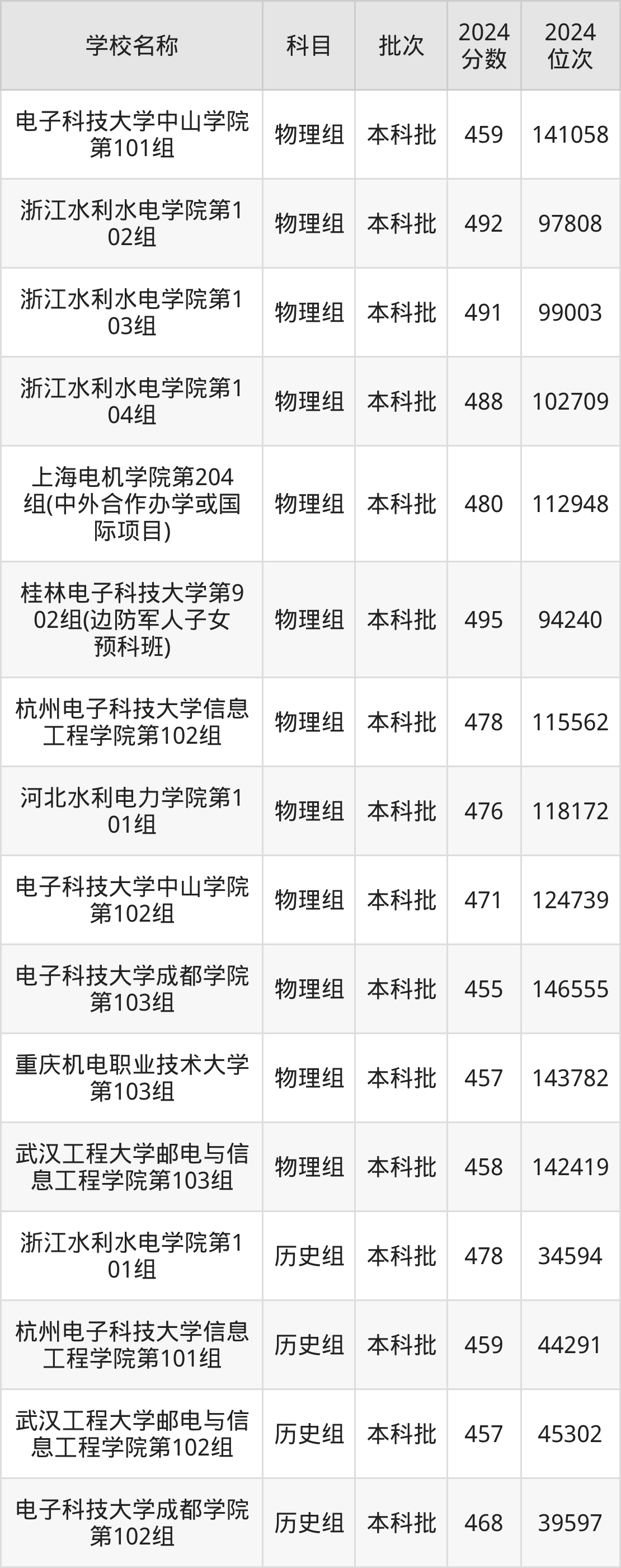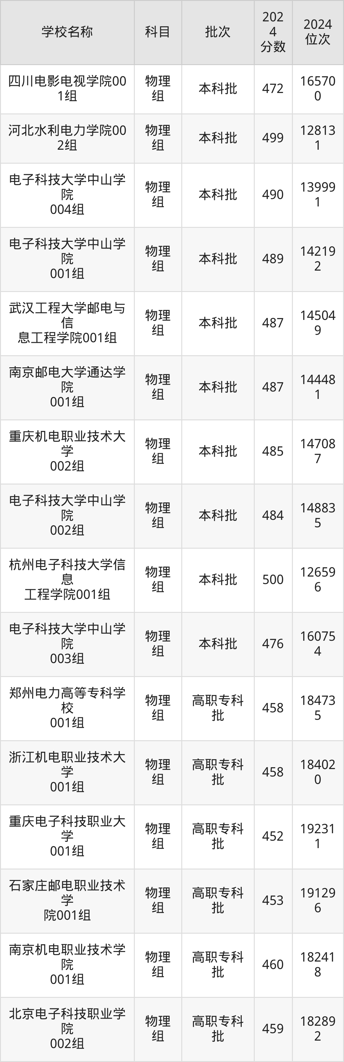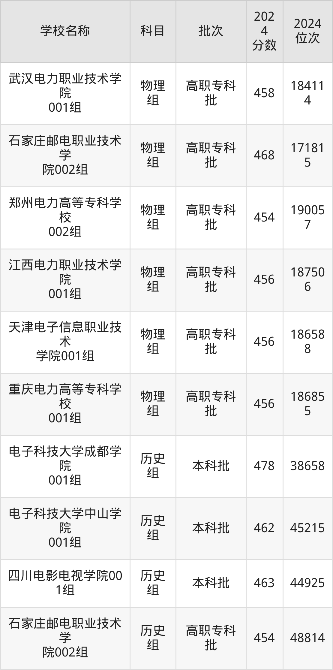 安徽高考历史组共有4所电力大学在450到500分之间录取,包含电子科技大学成都学院、四川电影电视学院、电子科技大学中山学院、石家庄邮电职业技术学院。