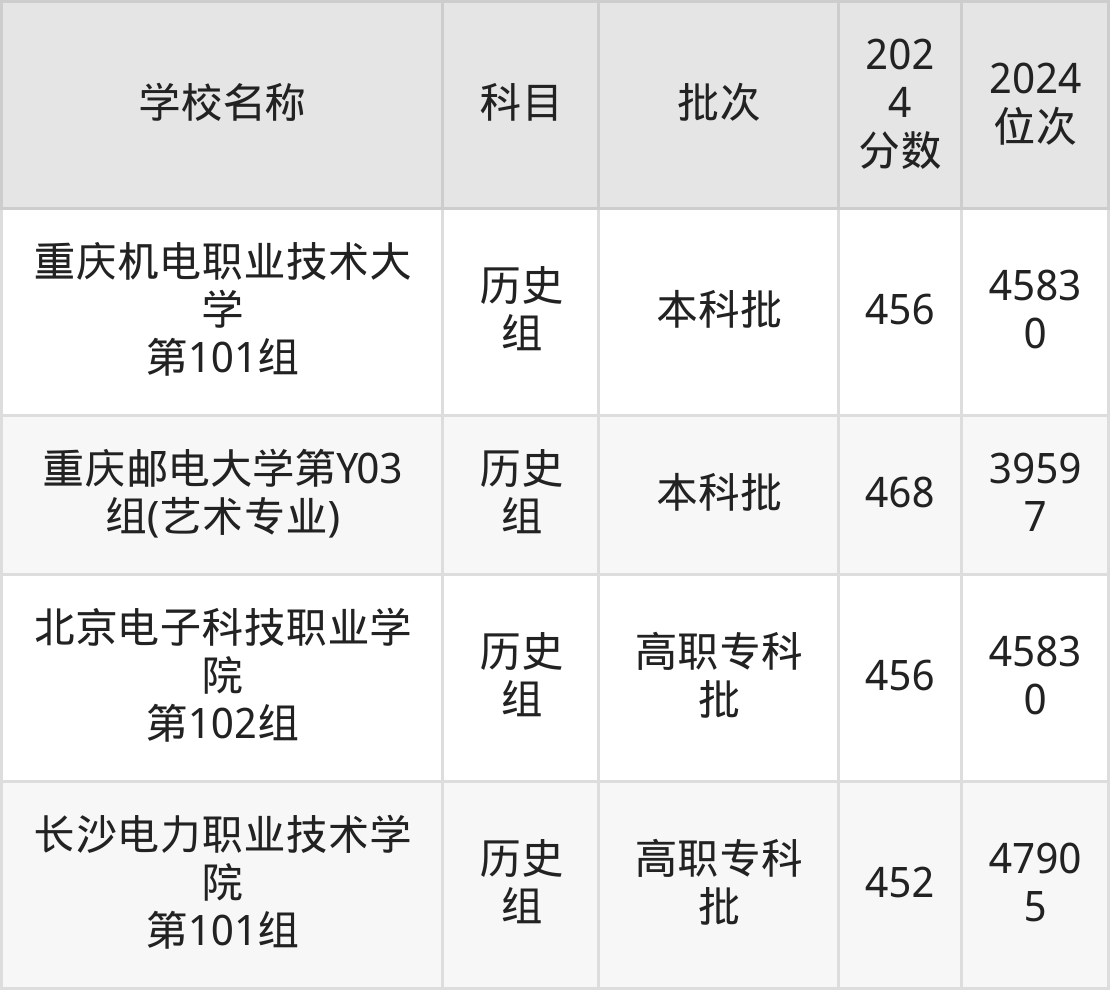 湖南高考历史组共有8所电力大学在450到500分之间录取,包含浙江水利水电学院、重庆邮电大学、电子科技大学成都学院、杭州电子科技大学信息工程学院、武汉工程大学邮电与信息工程学院、北京电子科技职业学院、重庆机电职业技术大学、长沙电力职业技术学院。
