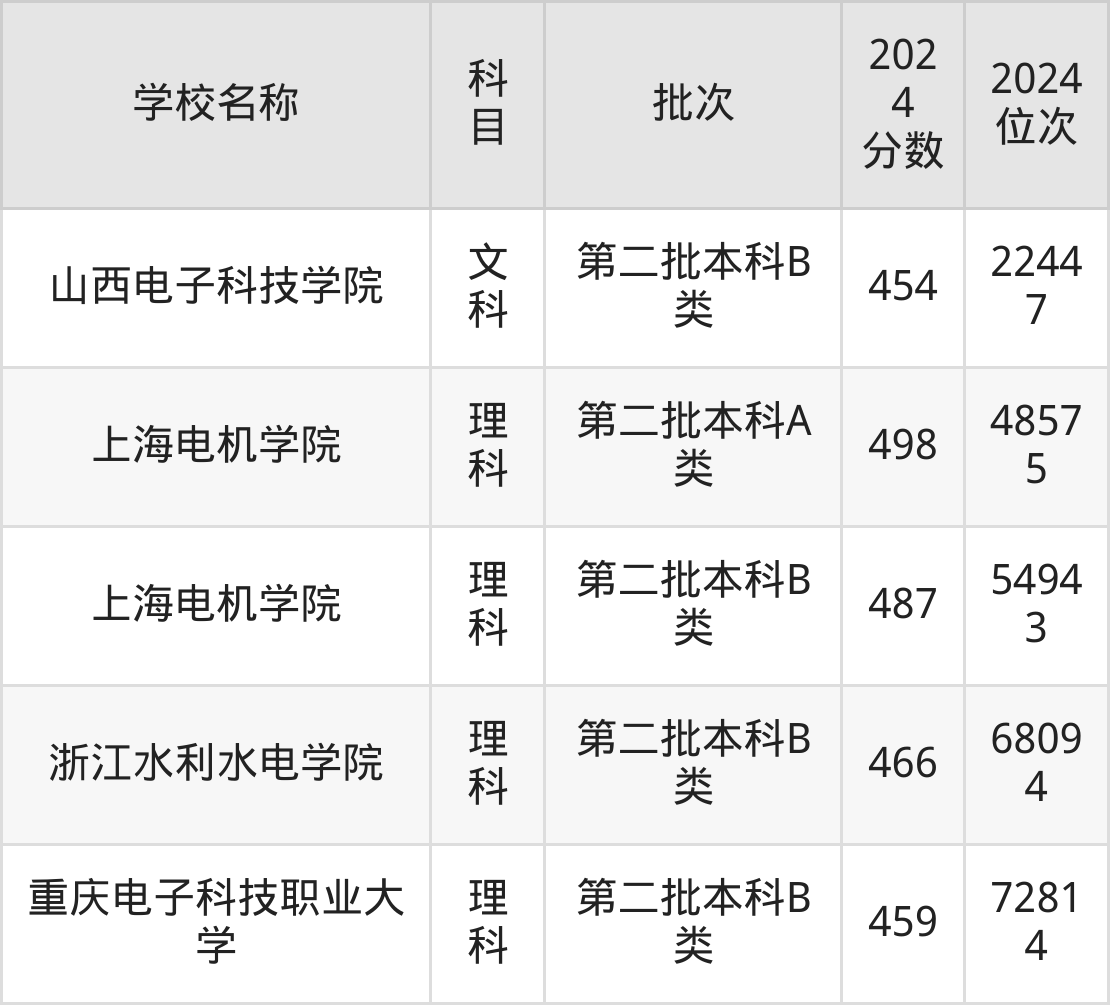 山西高考理科共有3所电力大学在450到500分之间录取,包含上海电机学院、浙江水利水电学院、重庆电子科技职业大学。
