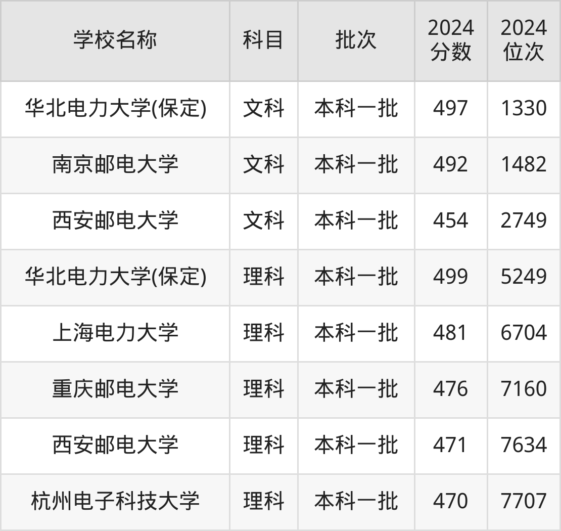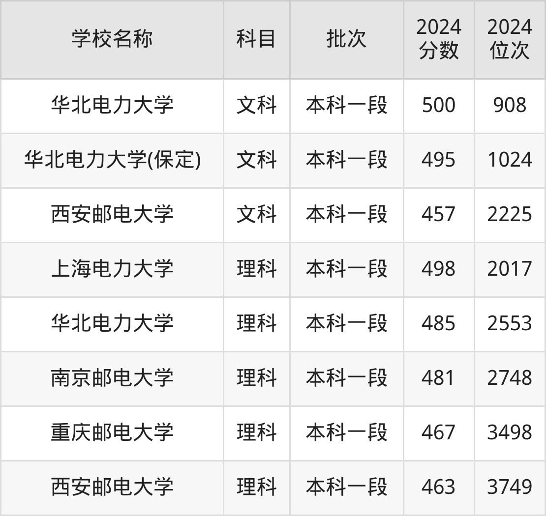 新疆高考文科共有3所电力大学在450到500分之间录取,包含华北电力大学(保定)、南京邮电大学、西安邮电大学。