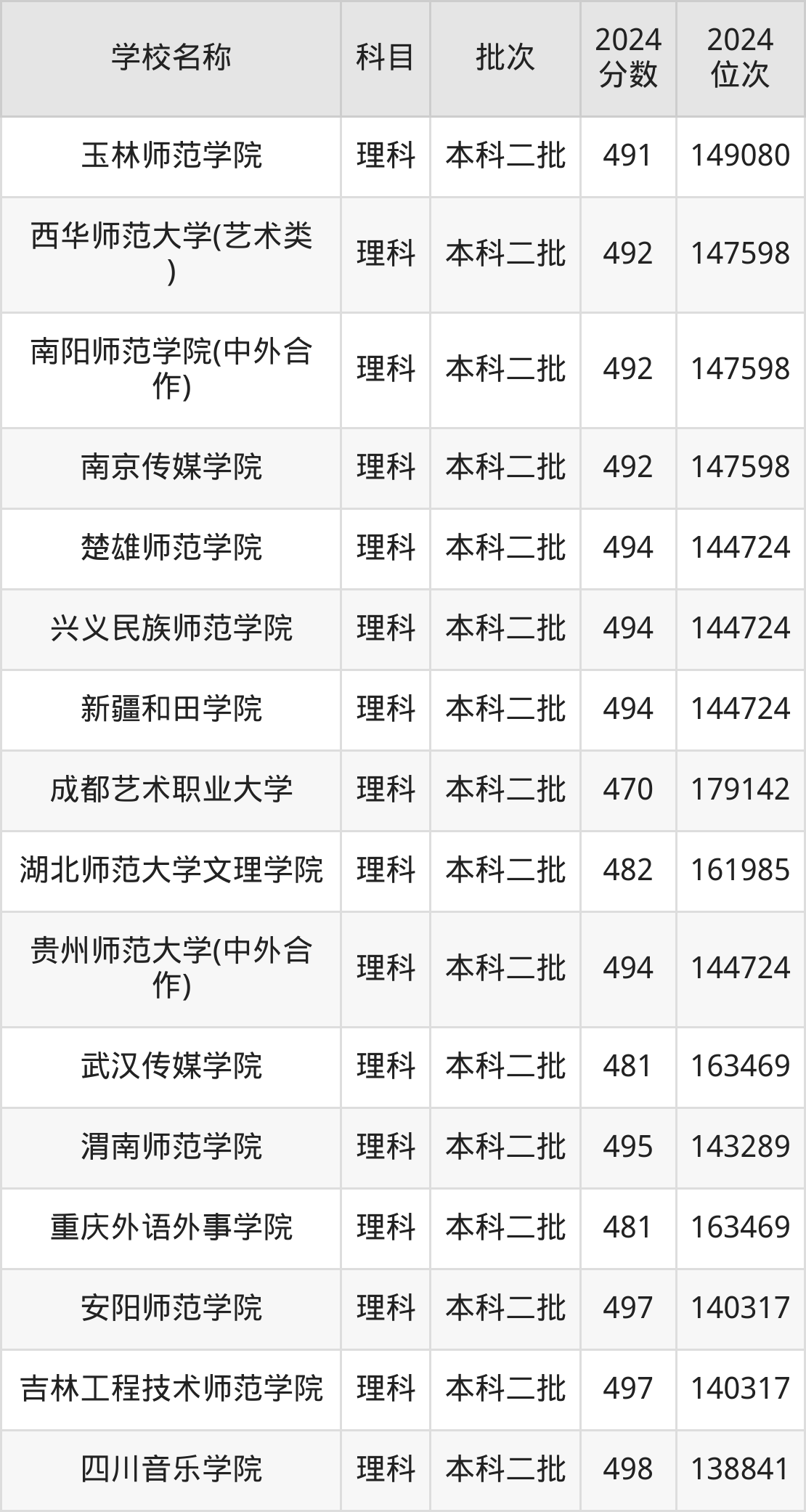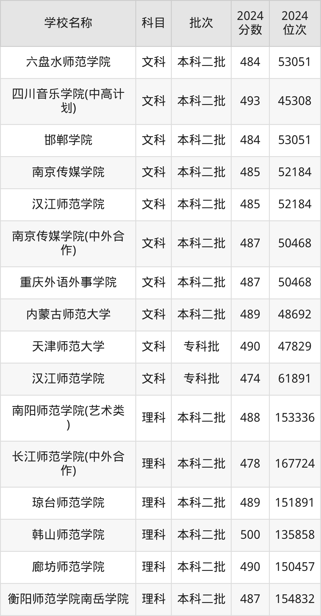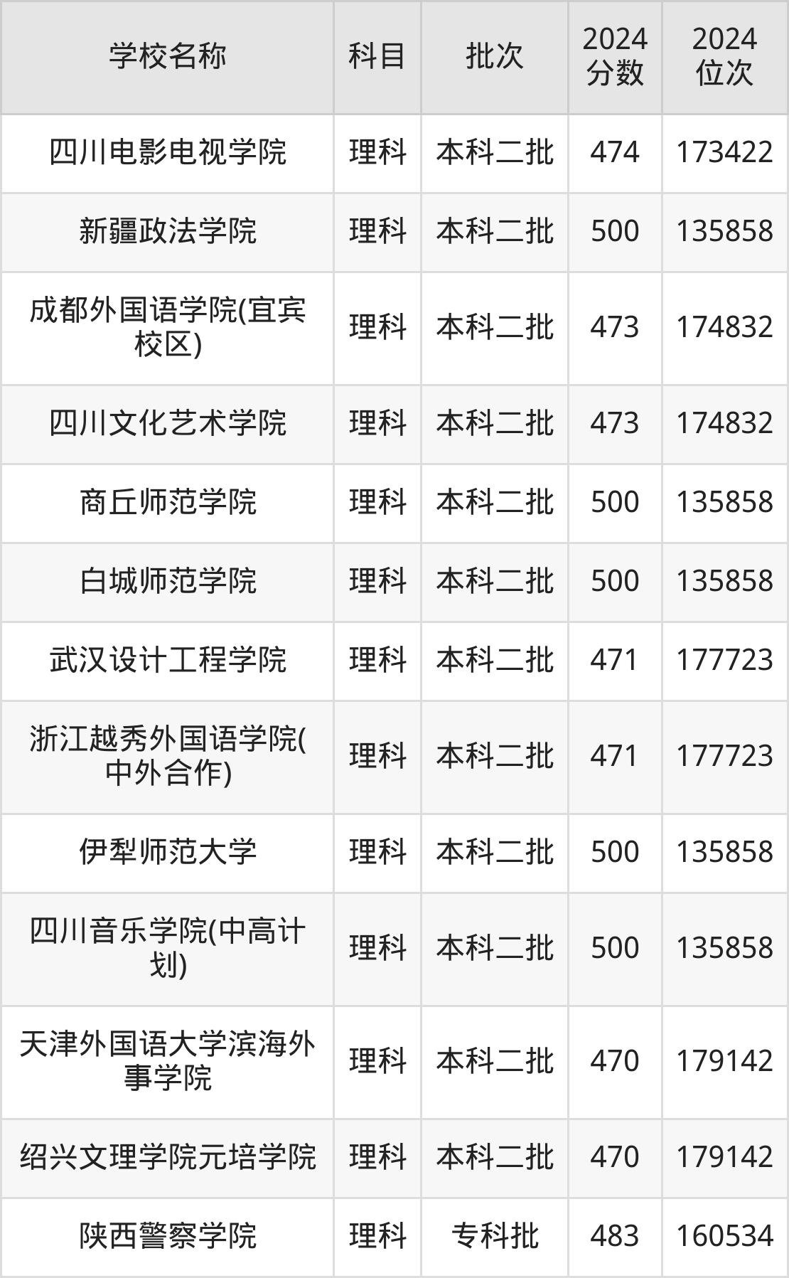 四川高考理科共有51所文科大学在470到500分之间录取,包含韩山师范学院、四川音乐学院(中高计划)、伊犁师范大学、白城师范学院、商丘师范学院、新疆政法学院、重庆第二师范学院(中外合作)、福建技术师范学院、内蒙古科技大学包头师范学院、通化师范学院。