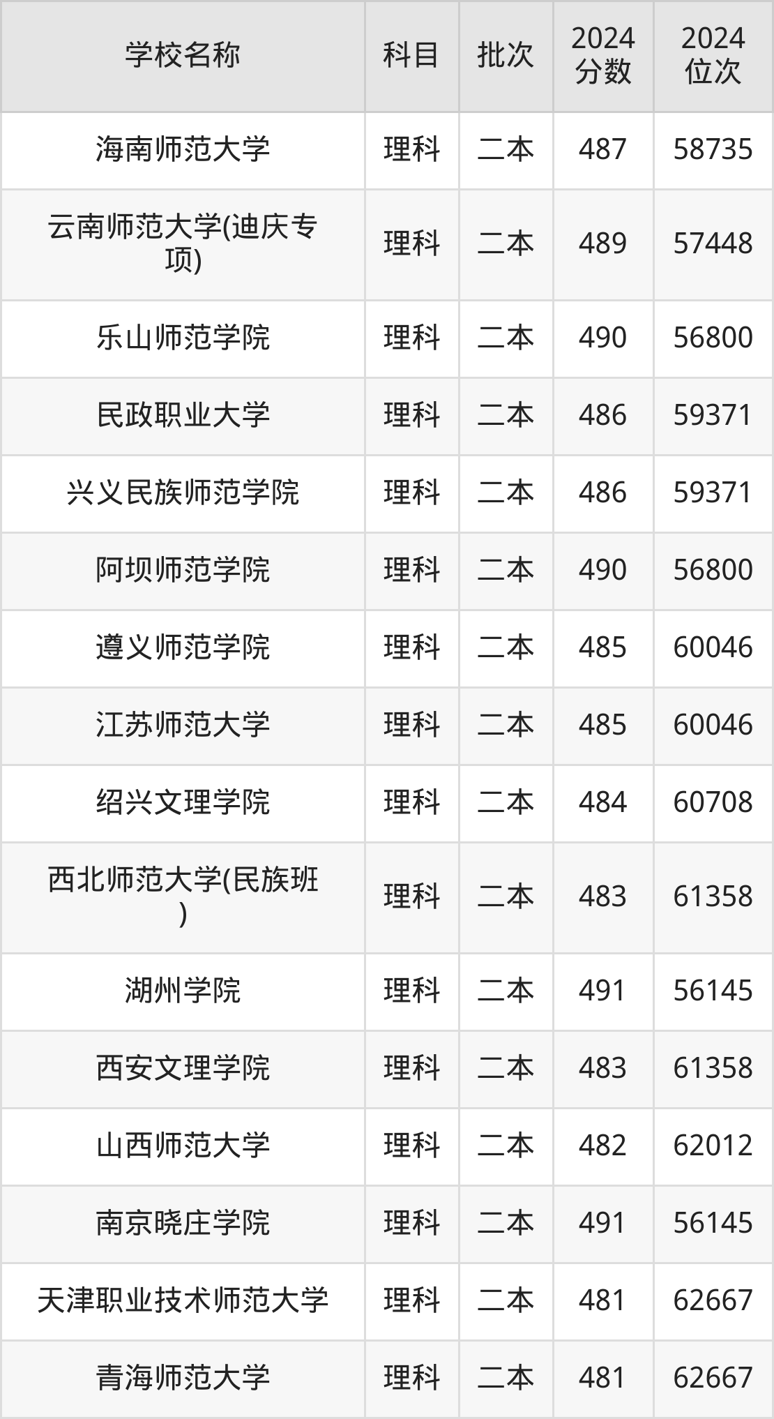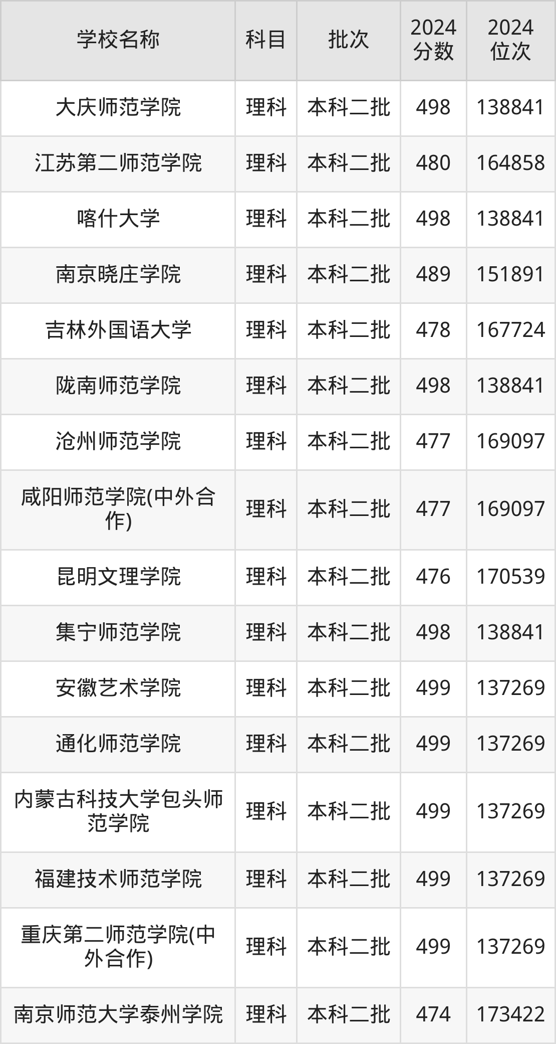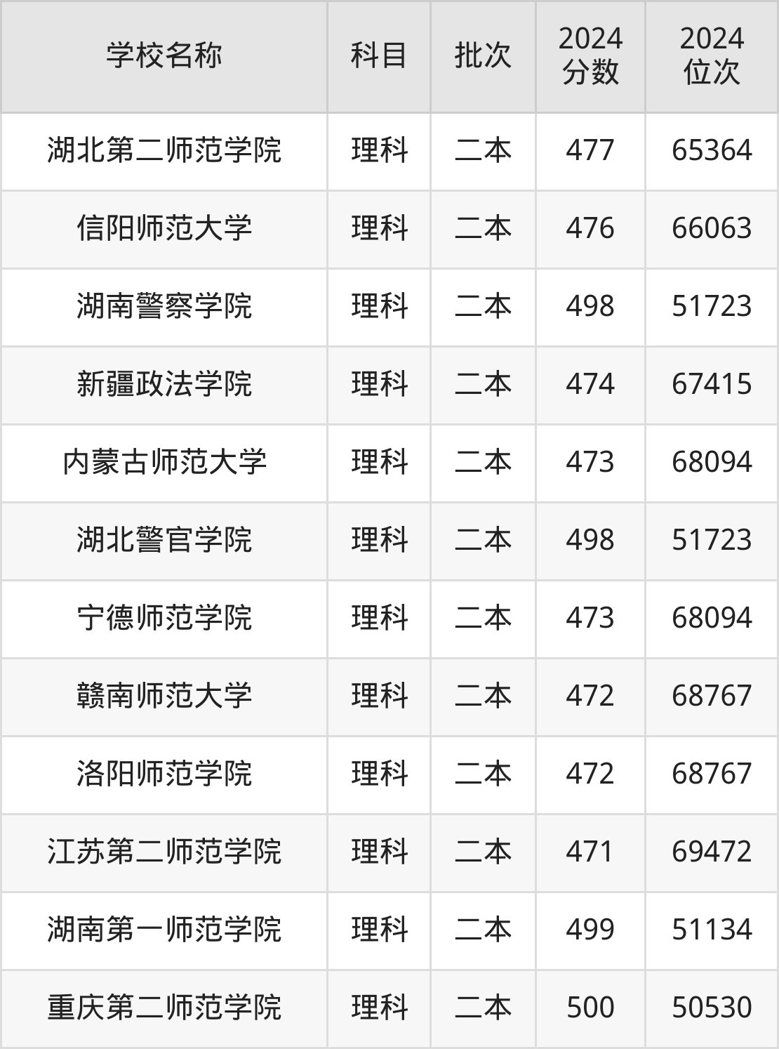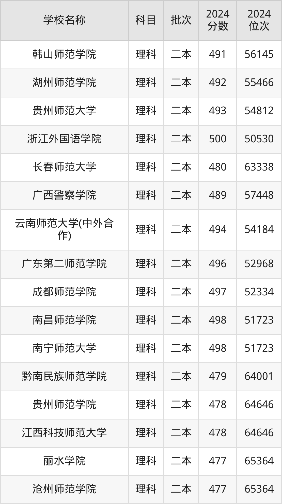 四川高考理科共有51所文科大学在470到500分之间录取,包含韩山师范学院、四川音乐学院(中高计划)、伊犁师范大学、白城师范学院、商丘师范学院、新疆政法学院、重庆第二师范学院(中外合作)、福建技术师范学院、内蒙古科技大学包头师范学院、通化师范学院。