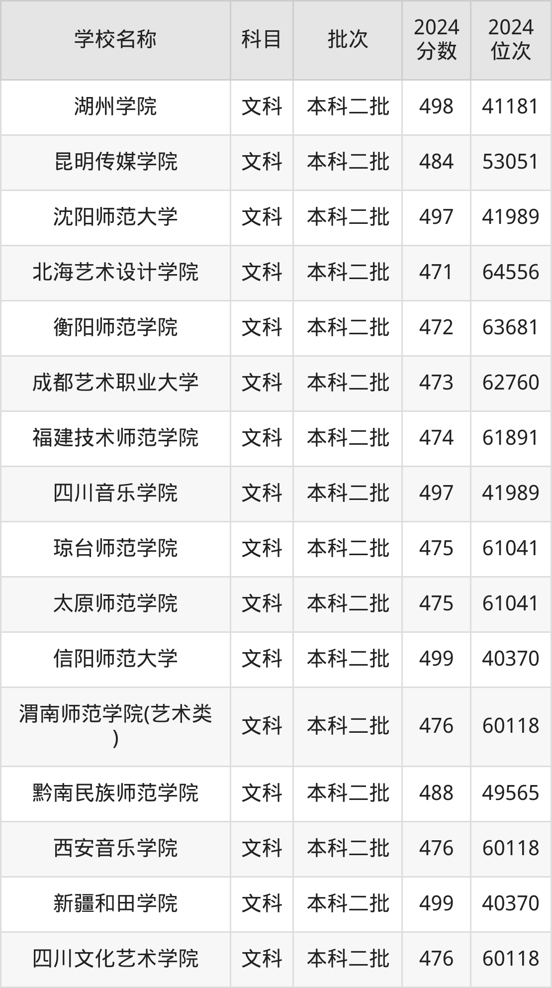 四川高考文科共有41所文科大学在470到500分之间录取,包含大庆师范学院、信阳师范大学、陕西学前师范学院、新疆和田学院、湖州学院、四川音乐学院、沈阳师范大学、宝鸡文理学院(艺术类)、中原科技学院、南宁师范大学。