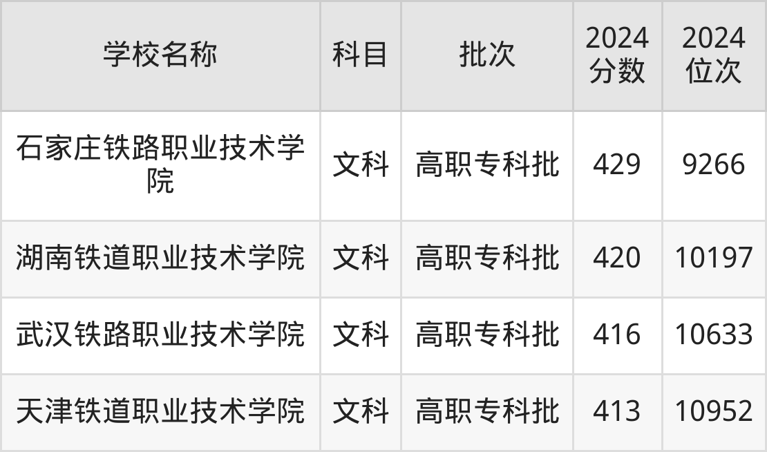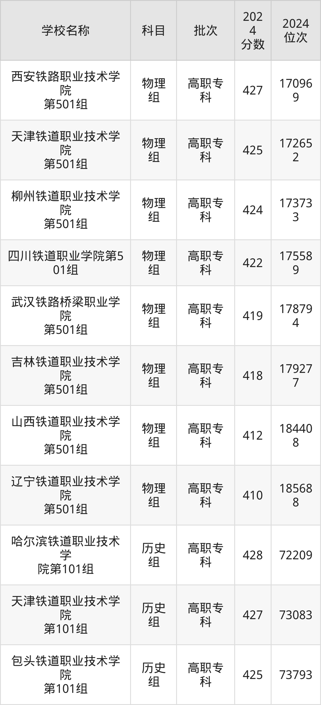 江西高考历史组共有3所铁路学校在410到430分之间录取,包含哈尔滨铁道职业技术学院、天津铁道职业技术学院、包头铁道职业技术学院。