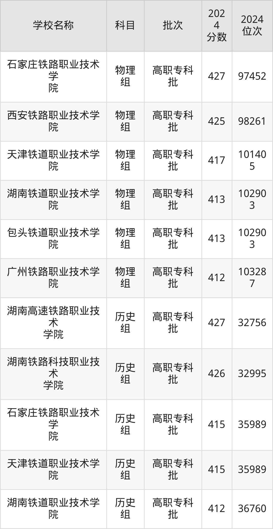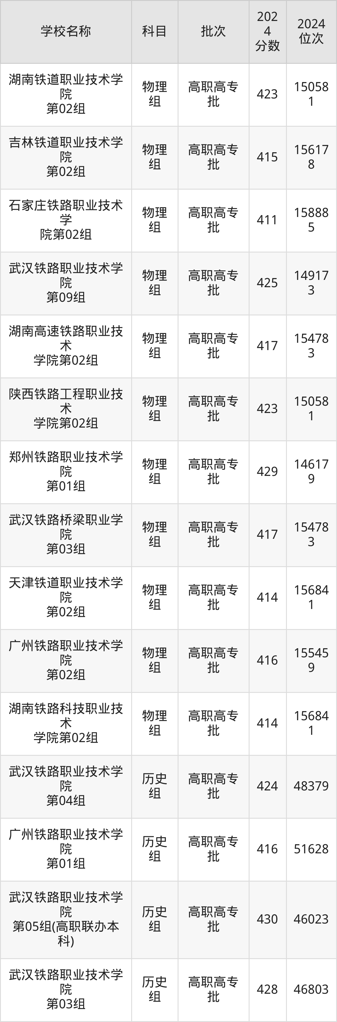 湖北高考历史组共有2所铁路学校在410到430分之间录取,包含武汉铁路职业技术学院、广州铁路职业技术学院。