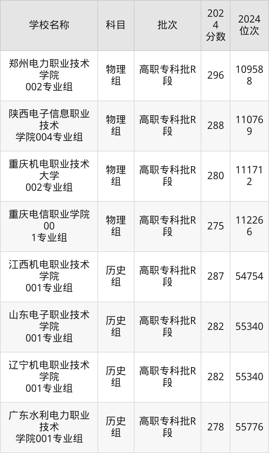 甘肃高考历史组共有4所电力大学在260到300分之间录取,包含江西机电职业技术学院、山东电子职业技术学院、辽宁机电职业技术学院、广东水利电力职业技术学院。