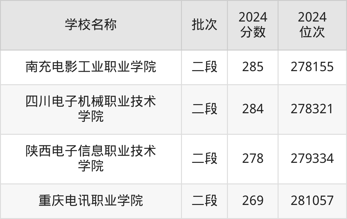 浙江高考共有4所电力大学在260到300分之间录取,包含南充电影工业职业学院、四川电子机械职业技术学院、陕西电子信息职业技术学院、重庆电讯职业学院。