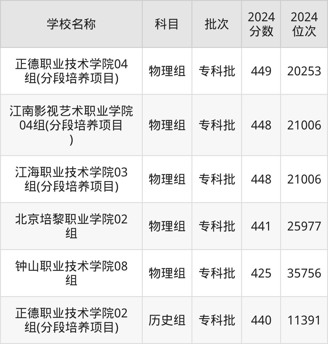 江苏高考历史组共有1所民办专科学校在420到450分之间录取,包含正德职业技术学院。