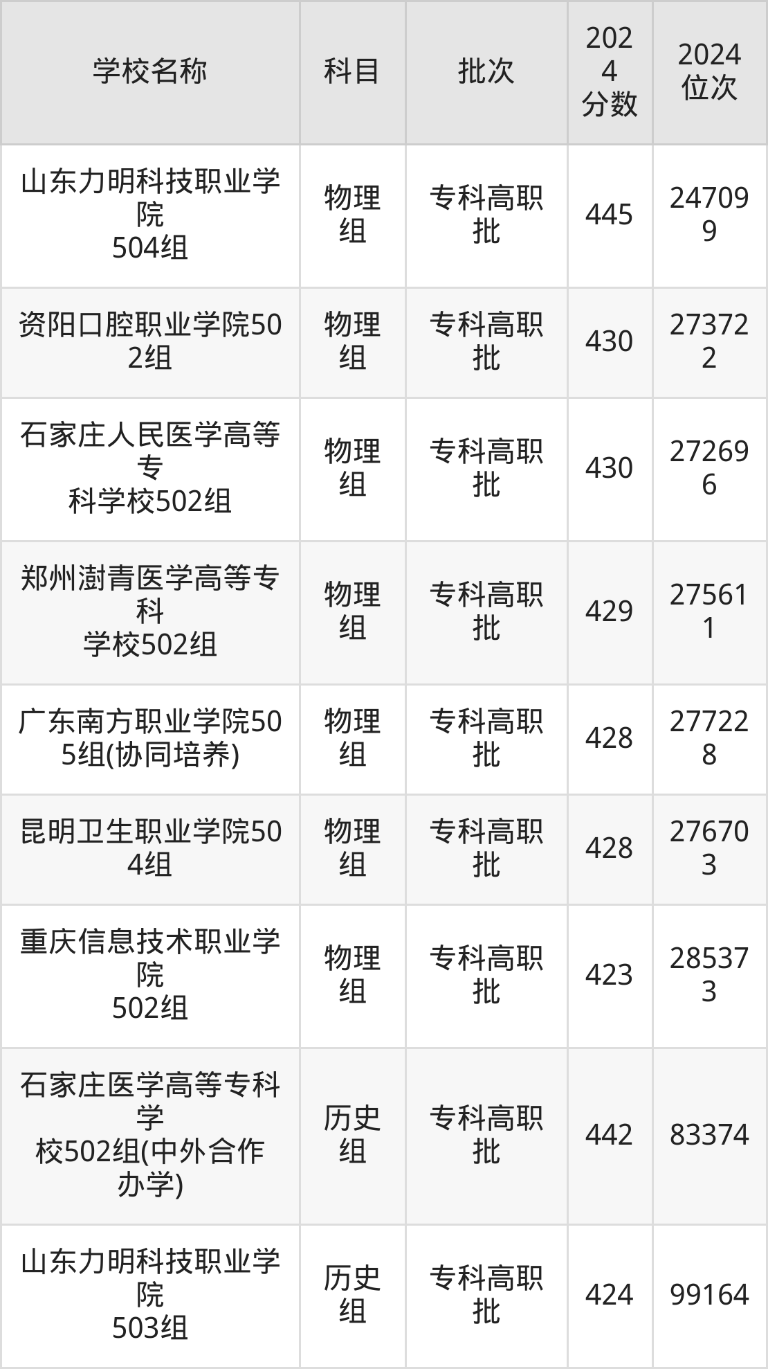 广东高考历史组共有2所民办专科学校在420到450分之间录取,包含石家庄医学高等专科学校、山东力明科技职业学院。