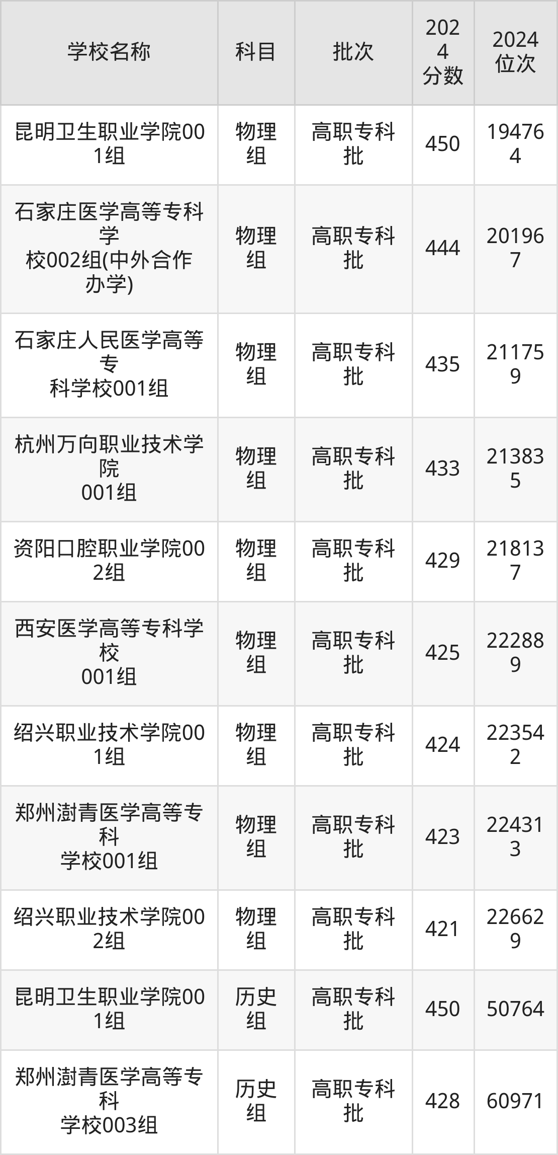 安徽高考历史组共有2所民办专科学校在420到450分之间录取,包含昆明卫生职业学院、郑州澍青医学高等专科学校。