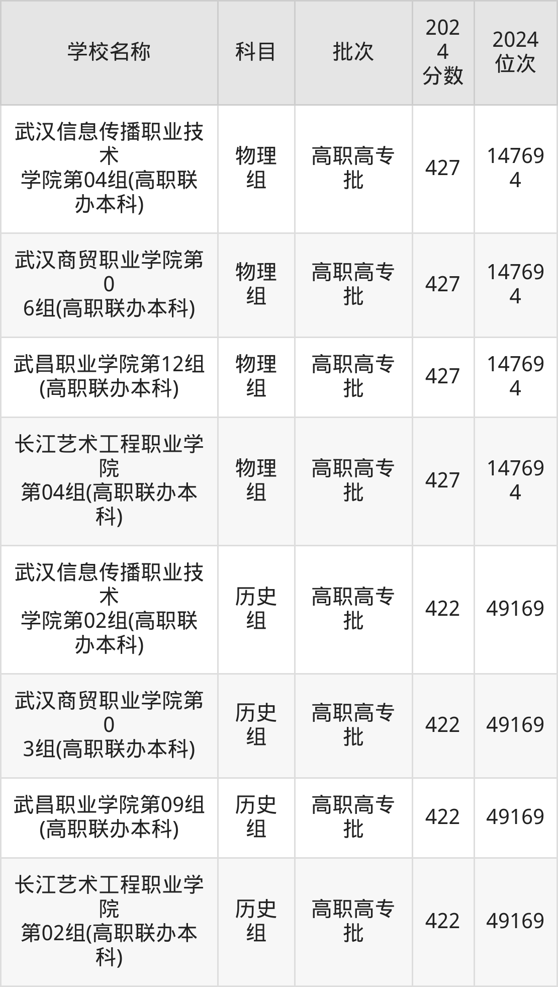湖北高考历史组共有4所民办专科学校在420到450分之间录取,包含武汉信息传播职业技术学院、武汉商贸职业学院、武昌职业学院、长江艺术工程职业学院。