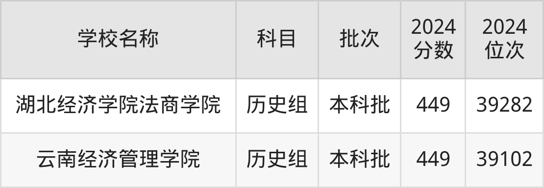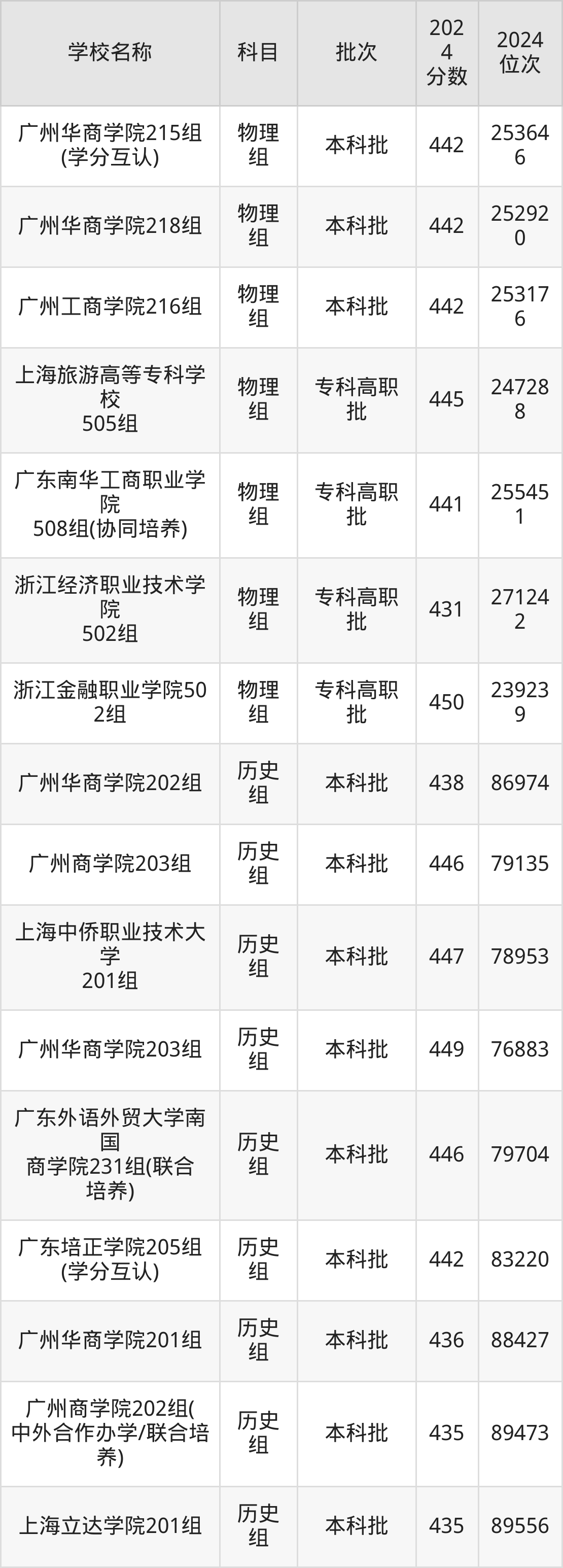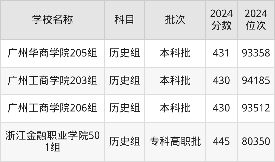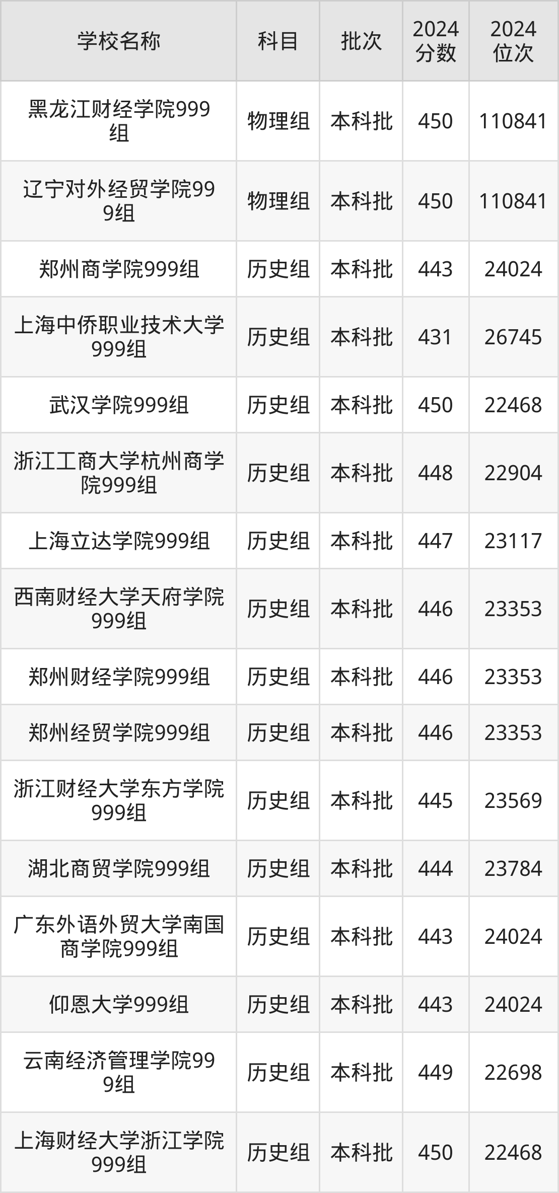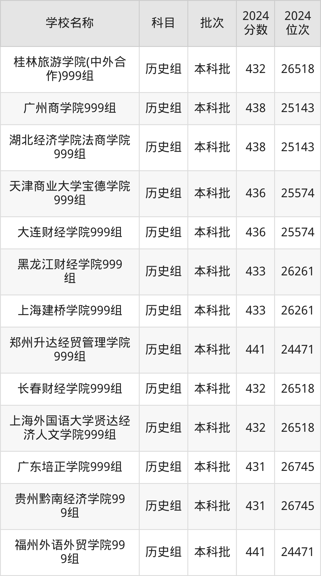 广东高考历史组共有8所财经大学在430到450分之间录取,包含广州华商学院、上海中侨职业技术大学、广州商学院、广东外语外贸大学南国商学院、浙江金融职业学院、广东培正学院、上海立达学院、广州工商学院。