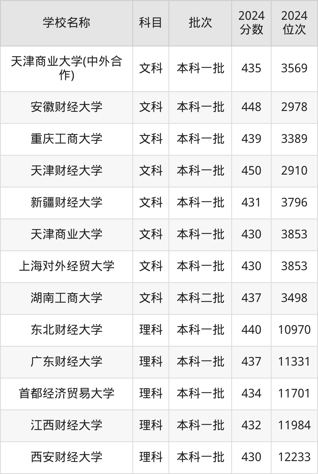 新疆高考理科共有5所财经大学在430到450分之间录取,包含东北财经大学、广东财经大学、首都经济贸易大学、江西财经大学、西安财经大学。