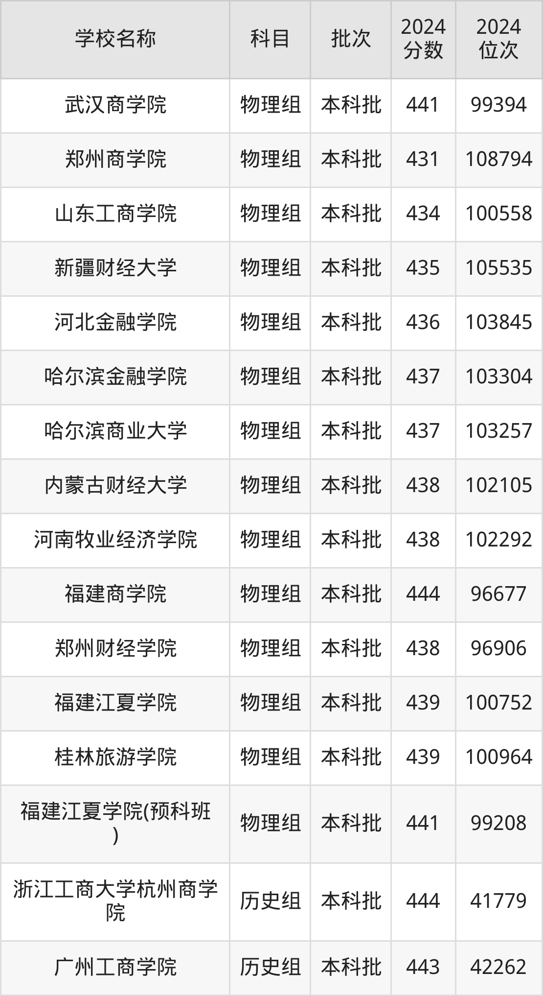 贵州高考物理组共有14所财经大学在430到450分之间录取,包含福建商学院、武汉商学院、福建江夏学院(预科班)、桂林旅游学院、福建江夏学院、郑州财经学院、河南牧业经济学院、内蒙古财经大学、哈尔滨商业大学、哈尔滨金融学院。