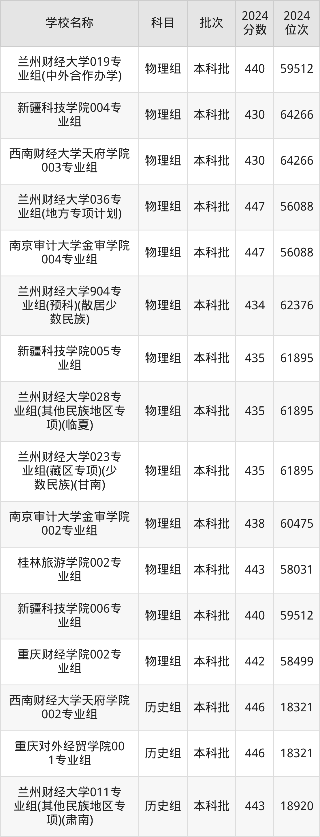 甘肃高考物理组共有6所财经大学在430到450分之间录取,包含兰州财经大学、南京审计大学金审学院、桂林旅游学院、重庆财经学院、新疆科技学院、西南财经大学天府学院。