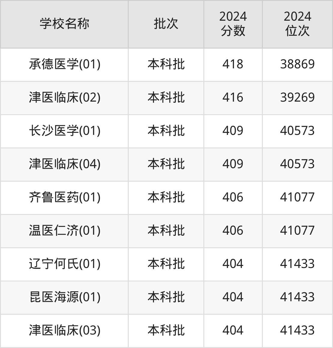 上海高考共有7所二本医学院在350到420分之间录取,包含承德医学院、天津医科大学临床医学院、长沙医学院、齐鲁医药学院、温州医科大学仁济学院、辽宁何氏医学院、昆明医科大学海源学院。