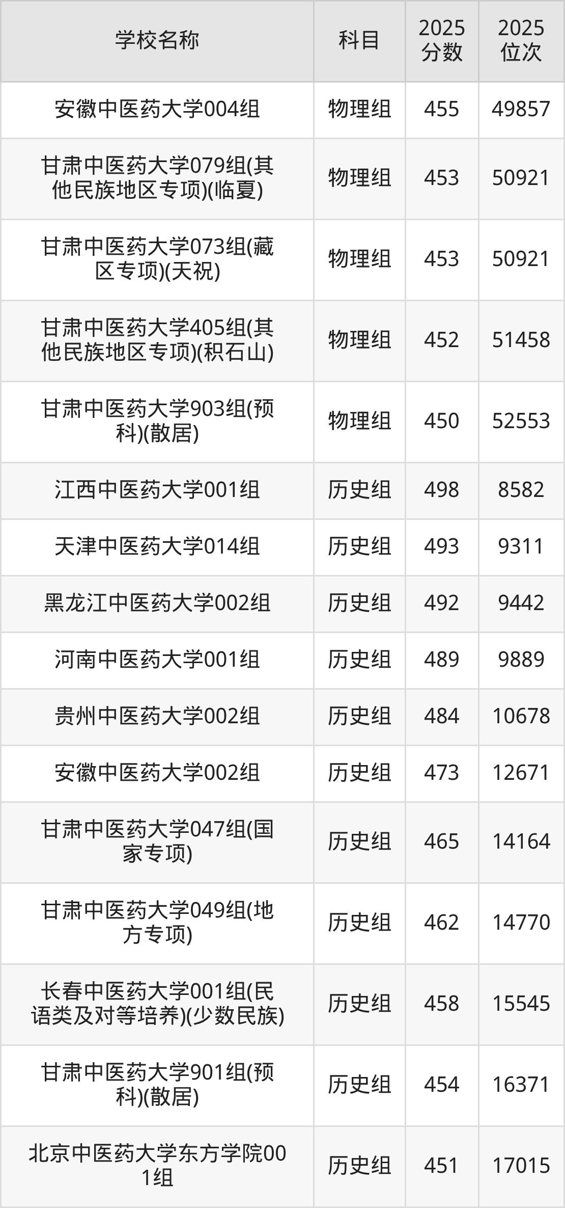 甘肃高考历史组共有9所中医药大学在450到500分之间录取,包含江西中医药大学、天津中医药大学、黑龙江中医药大学、河南中医药大学、贵州中医药大学、安徽中医药大学、甘肃中医药大学、长春中医药大学、北京中医药大学东方学院。