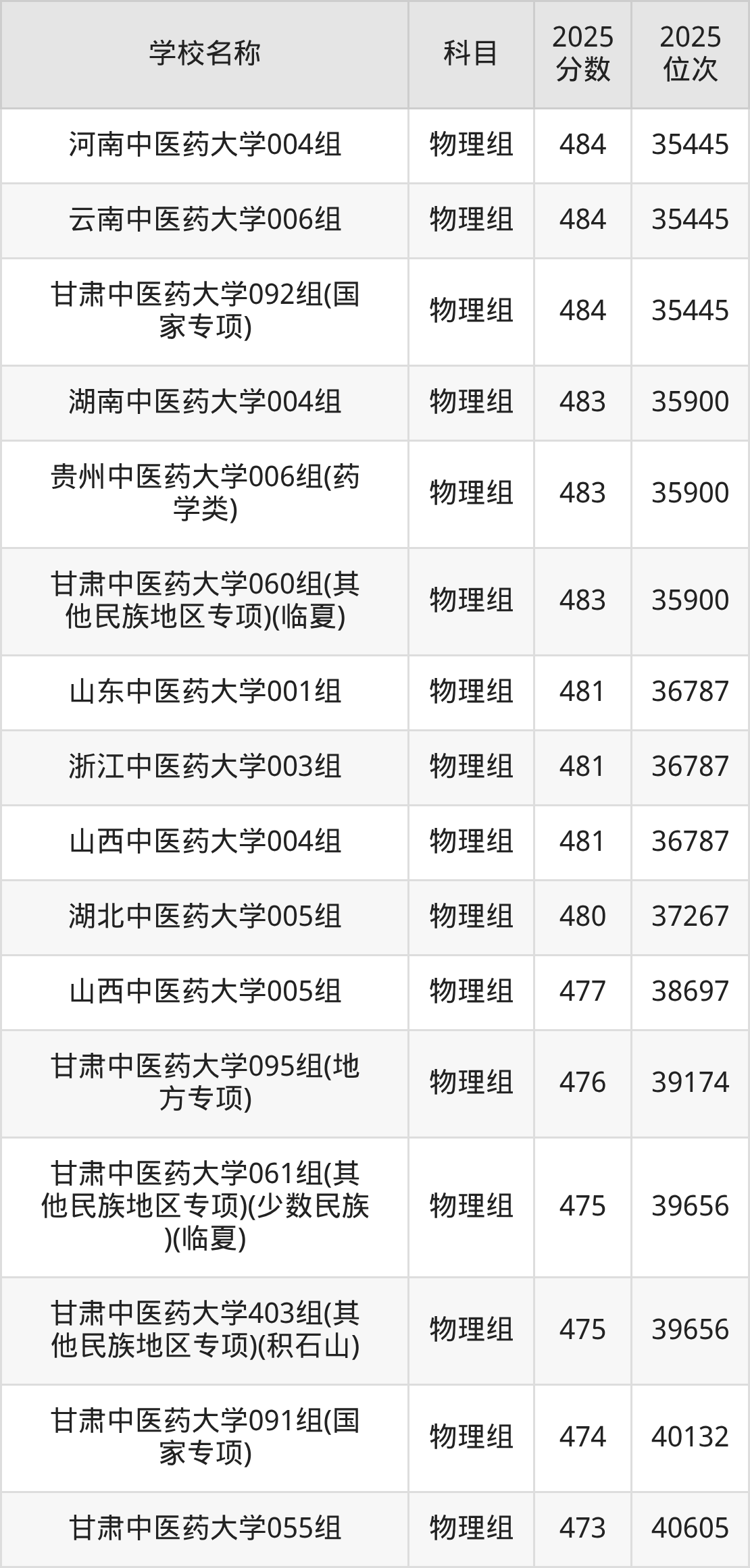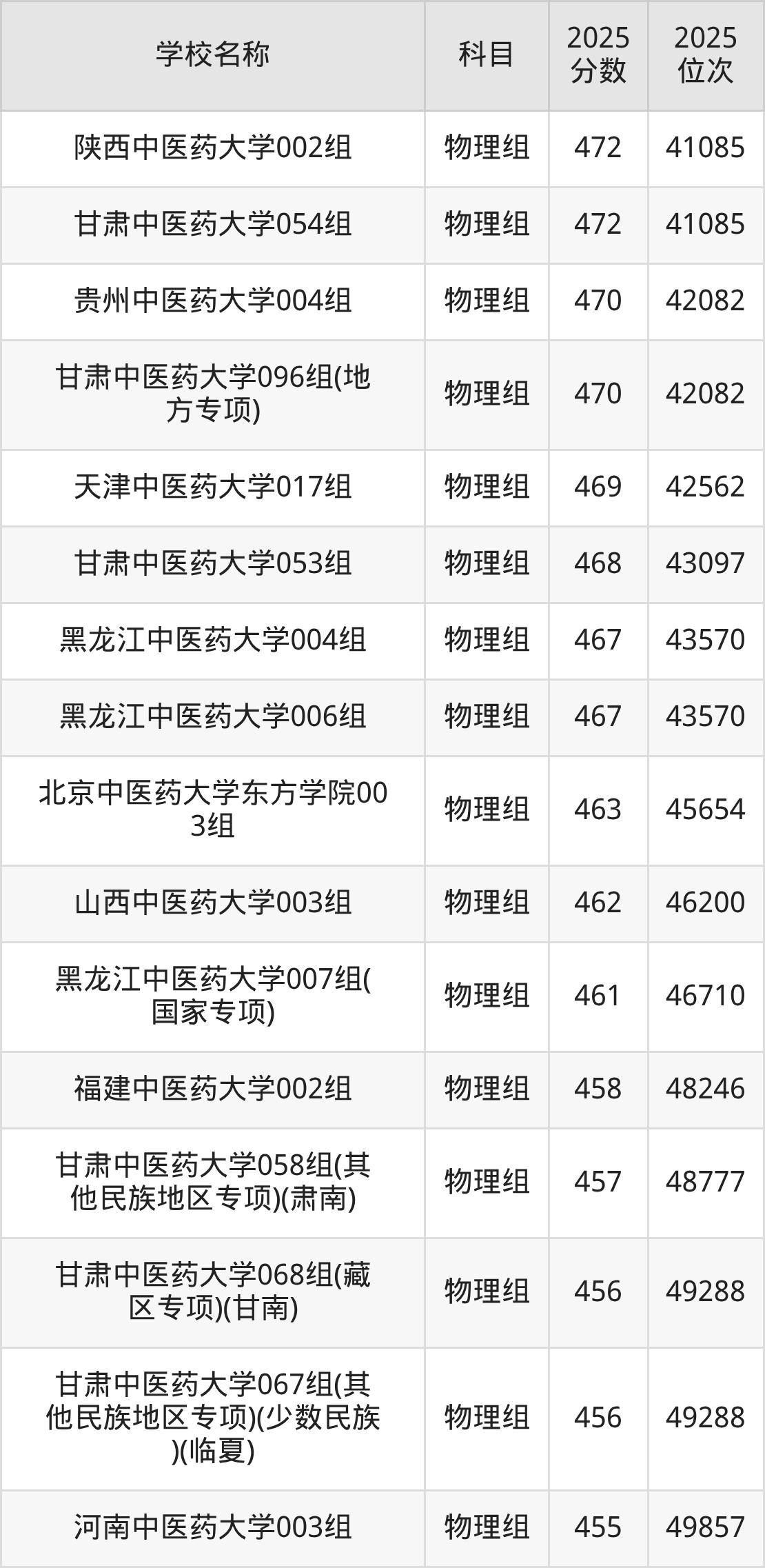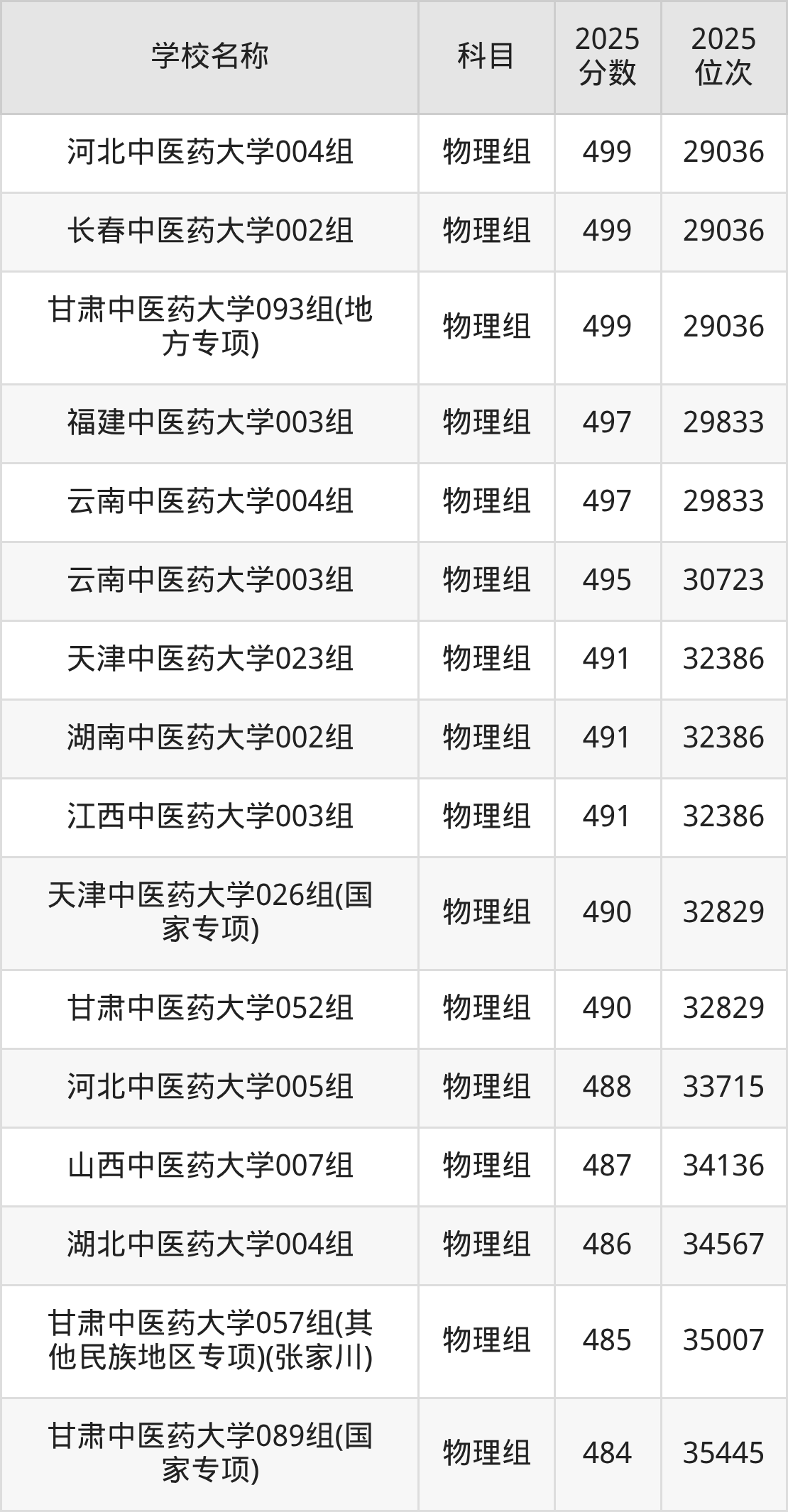 甘肃高考物理组共有18所中医药大学在450到500分之间录取,包含河北中医药大学、长春中医药大学、甘肃中医药大学、福建中医药大学、云南中医药大学、天津中医药大学、江西中医药大学、湖南中医药大学、山西中医药大学、湖北中医药大学。