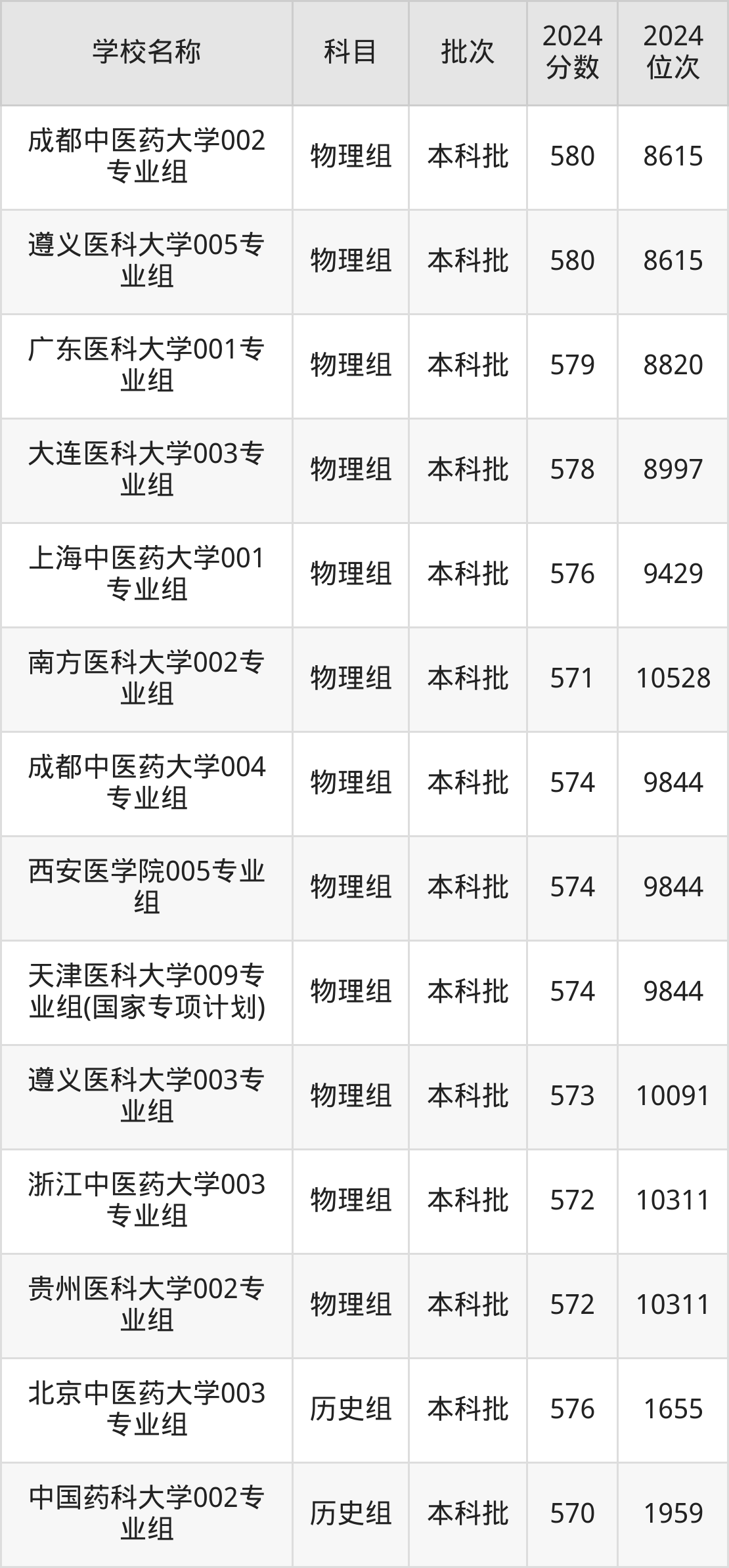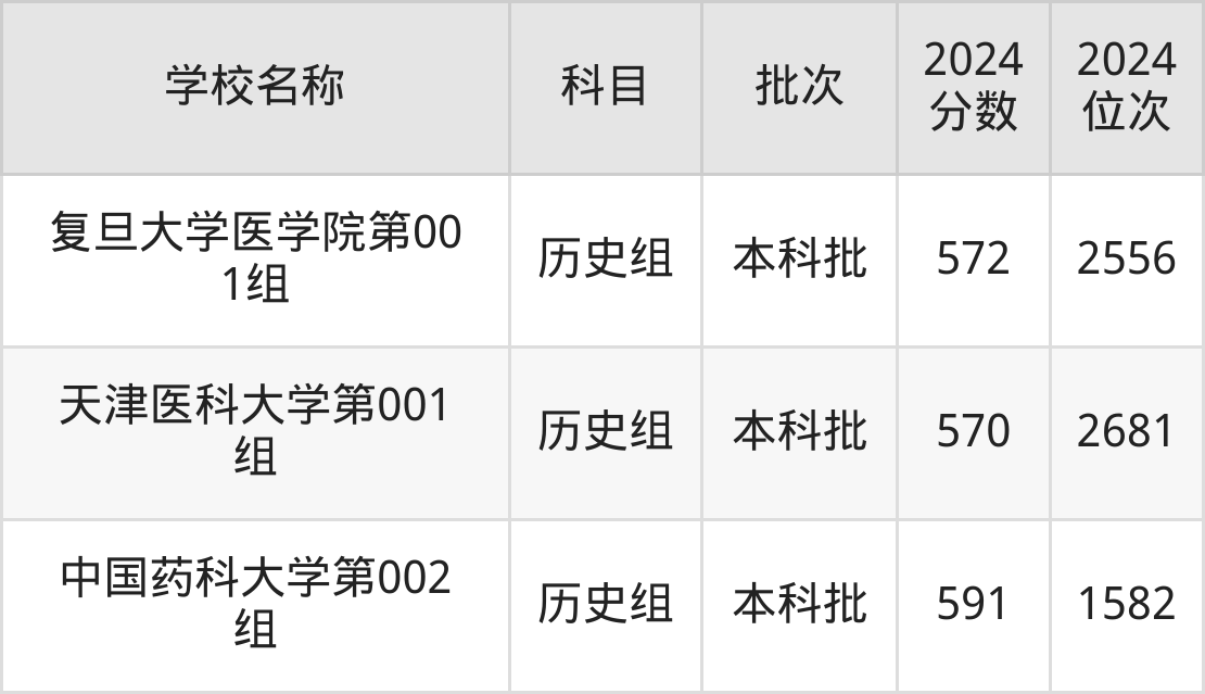 贵州高考历史组共有3所医科大学在570到600分之间录取,包含复旦大学上海医学院、中国药科大学、北京中医药大学。