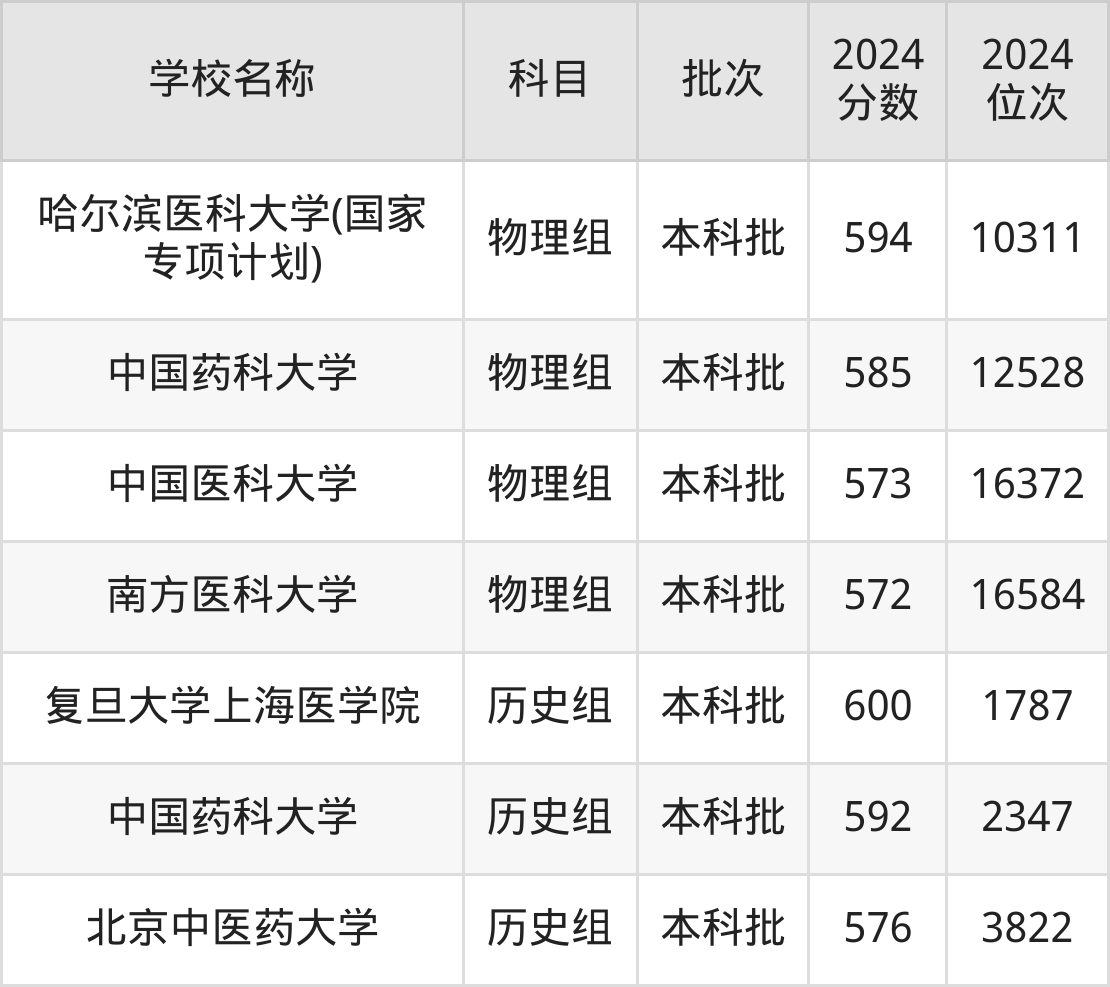 黑龙江高考历史组共有4所医科大学在570到600分之间录取,包含中国药科大学、北京中医药大学、复旦大学上海医学院、天津医科大学。