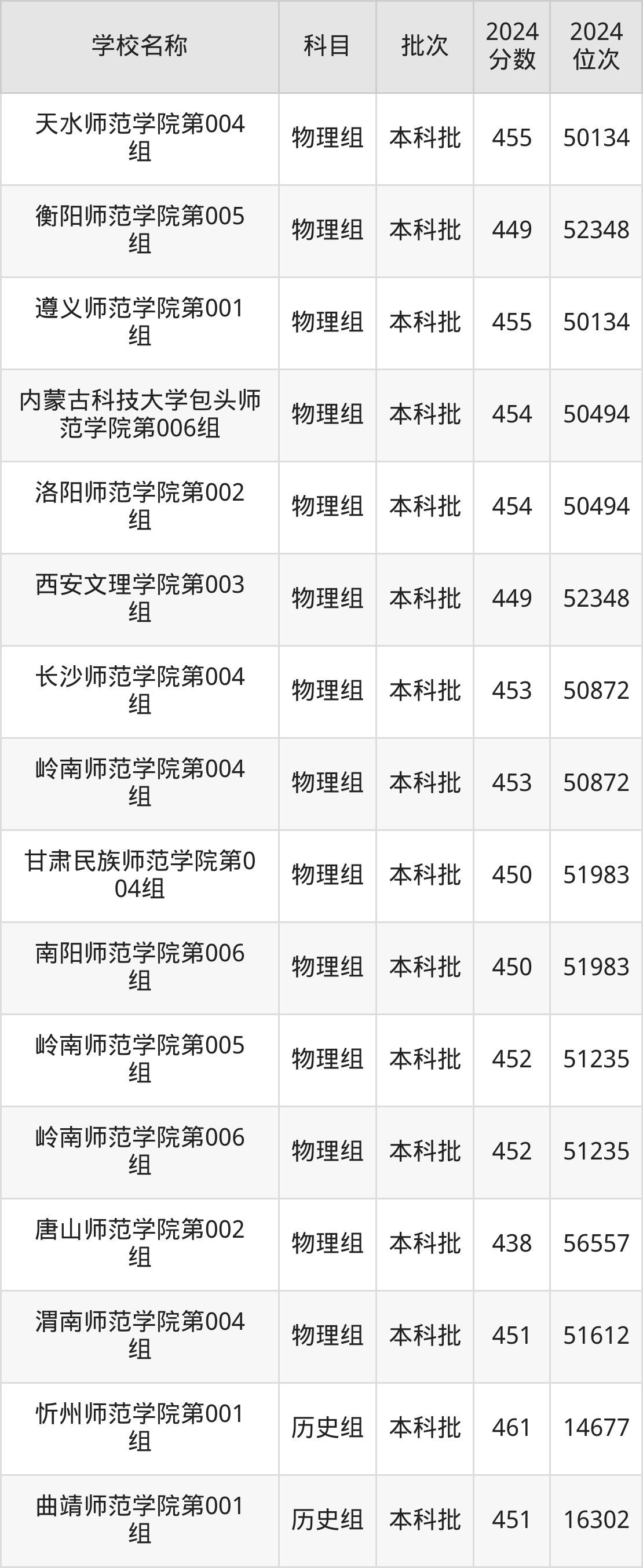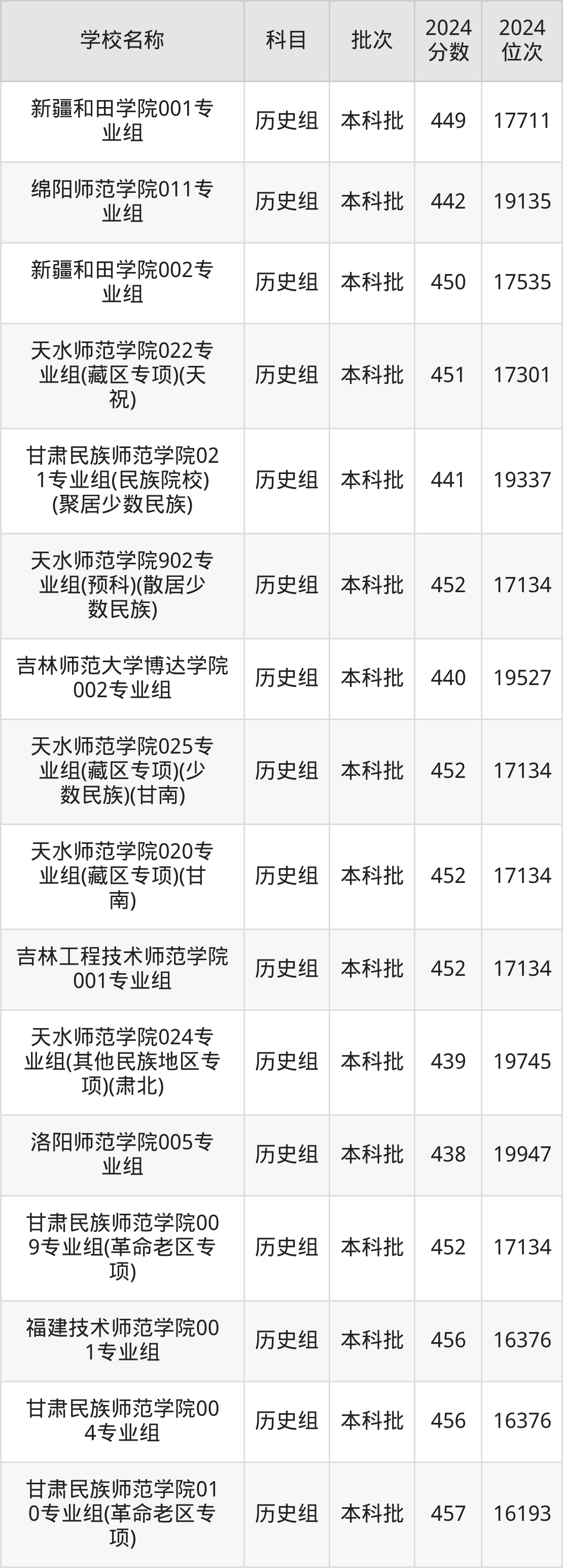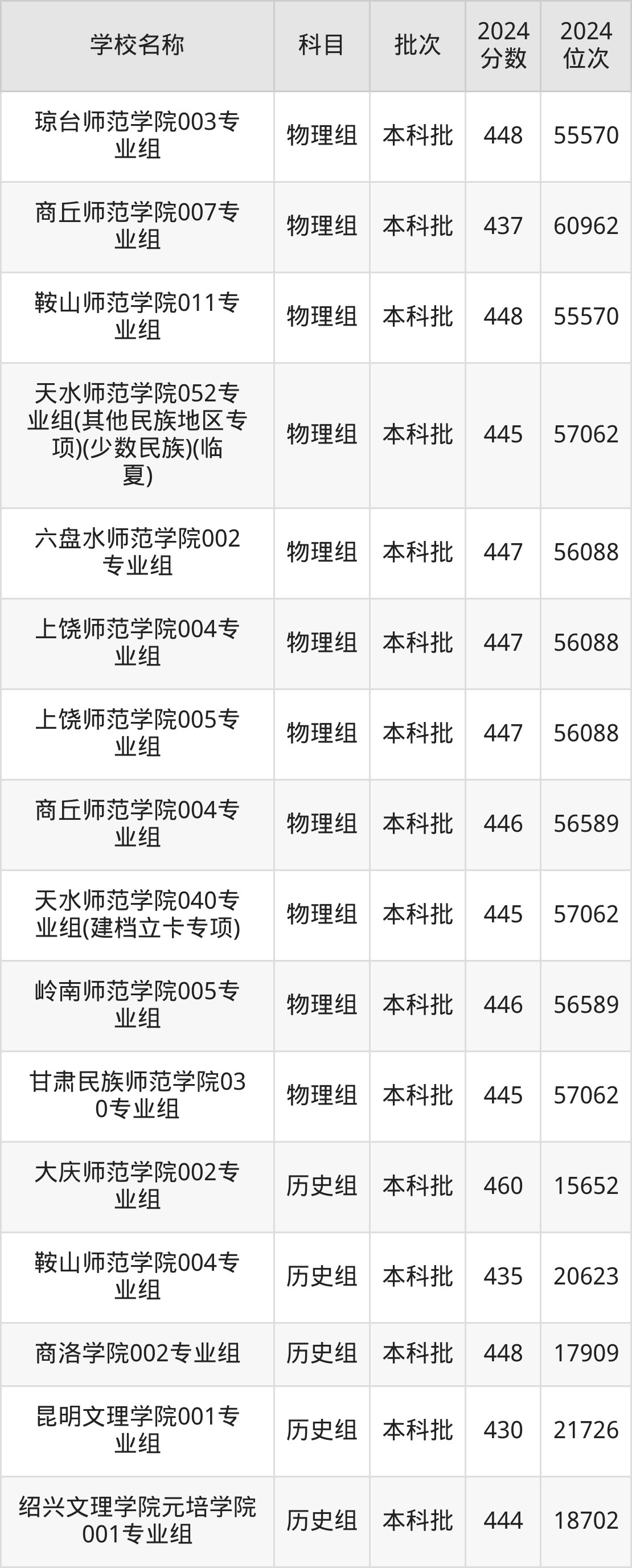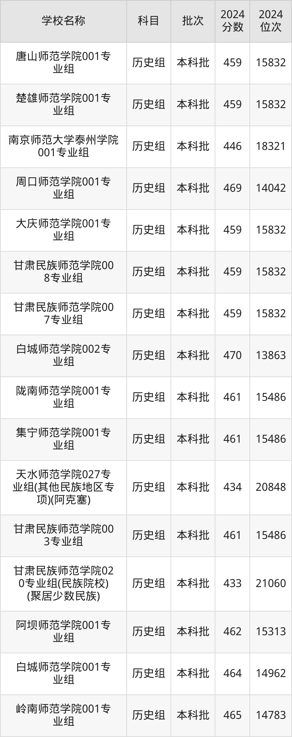 甘肃高考历史组共有25所二本师范大学在430到470分之间录取,包含白城师范学院、周口师范学院、牡丹江师范学院、玉林师范学院、鞍山师范学院、甘肃民族师范学院、阿坝师范学院、集宁师范学院、岭南师范学院、陇南师范学院。