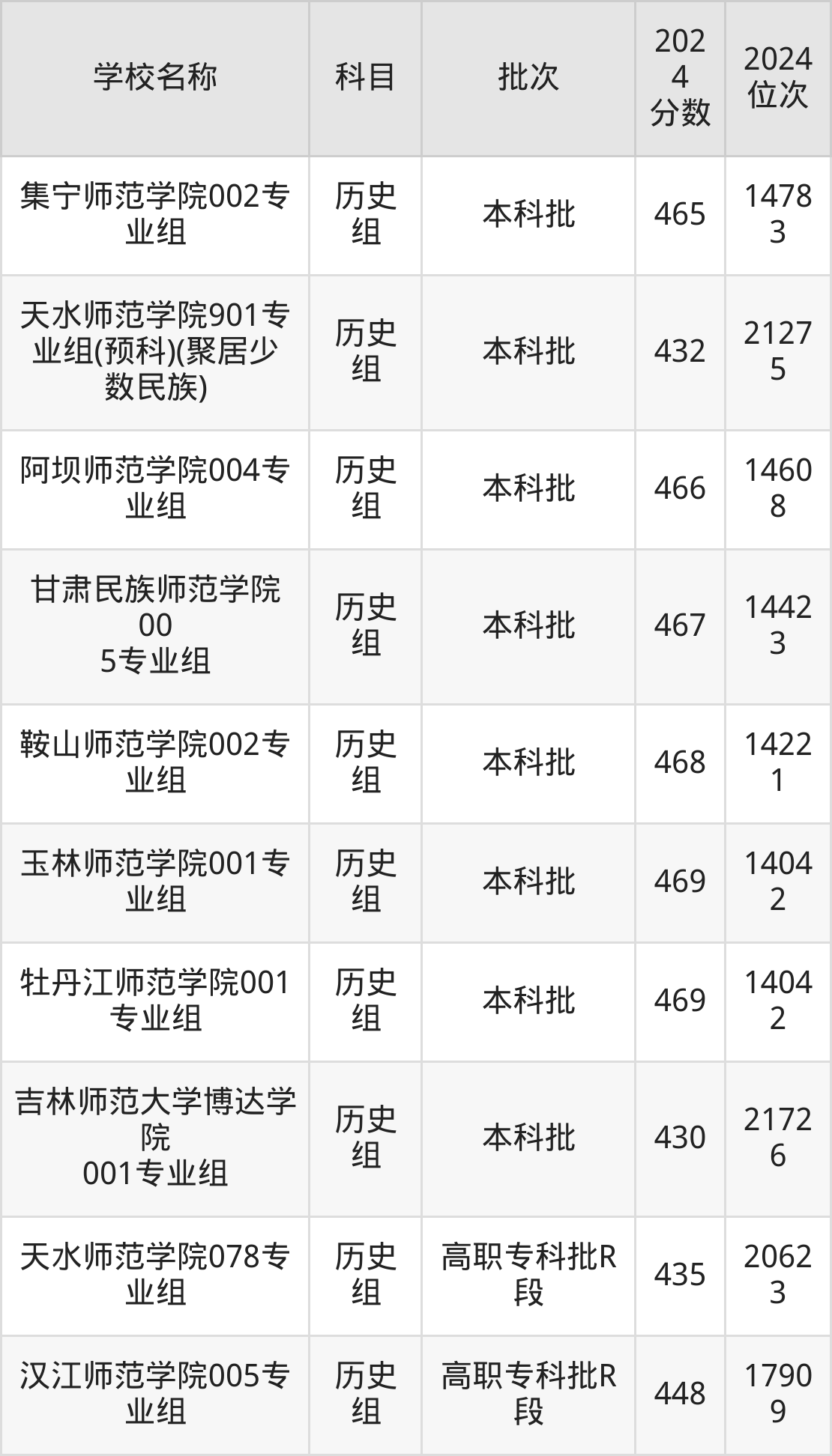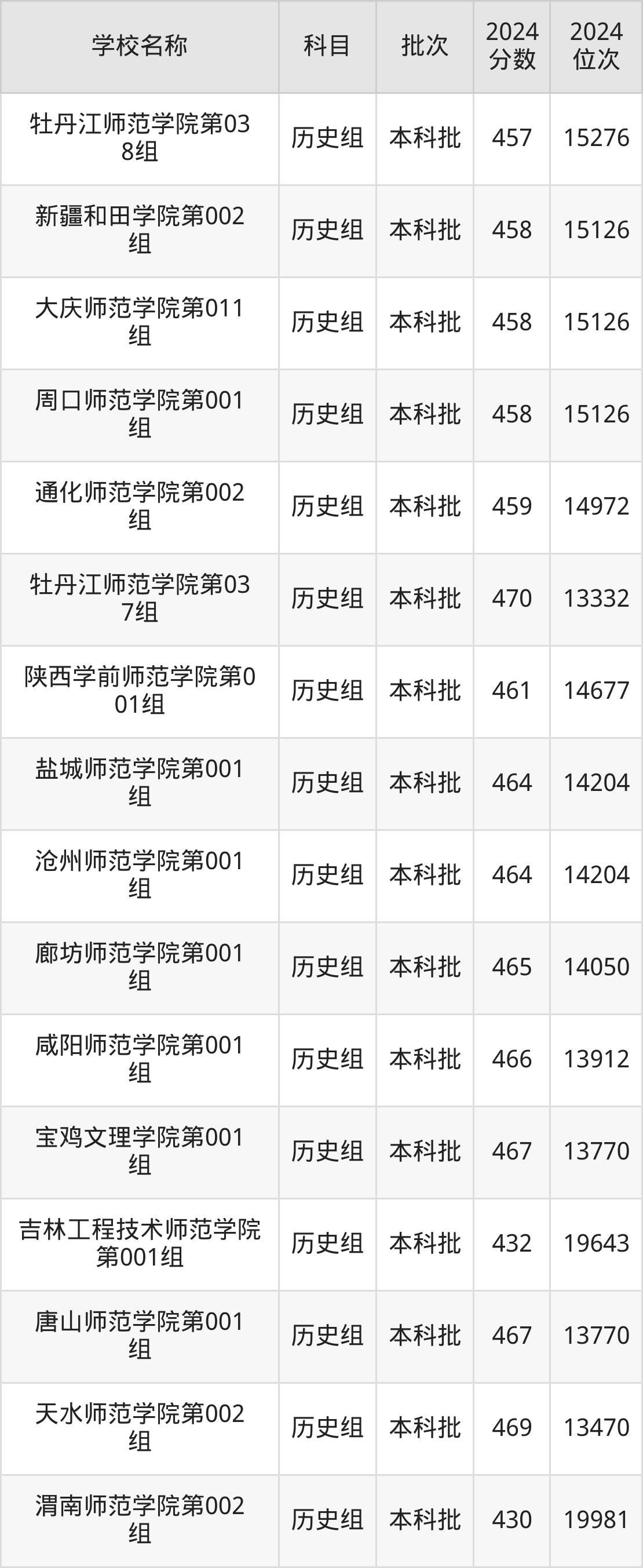 黑龙江高考历史组共有29所二本师范大学在430到470分之间录取,包含牡丹江师范学院、忻州师范学院、天水师范学院、唐山师范学院、宝鸡文理学院、咸阳师范学院、廊坊师范学院、沧州师范学院、盐城师范学院、陕西学前师范学院。
