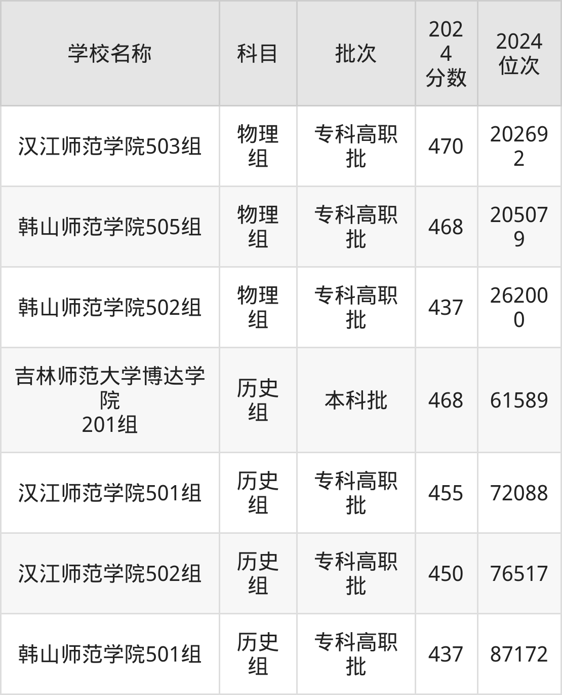 广东高考历史组共有3所二本师范大学在430到470分之间录取,包含吉林师范大学博达学院、汉江师范学院、韩山师范学院。