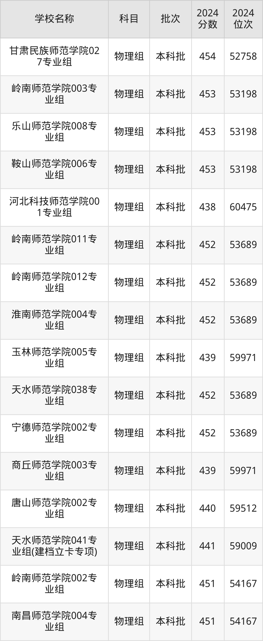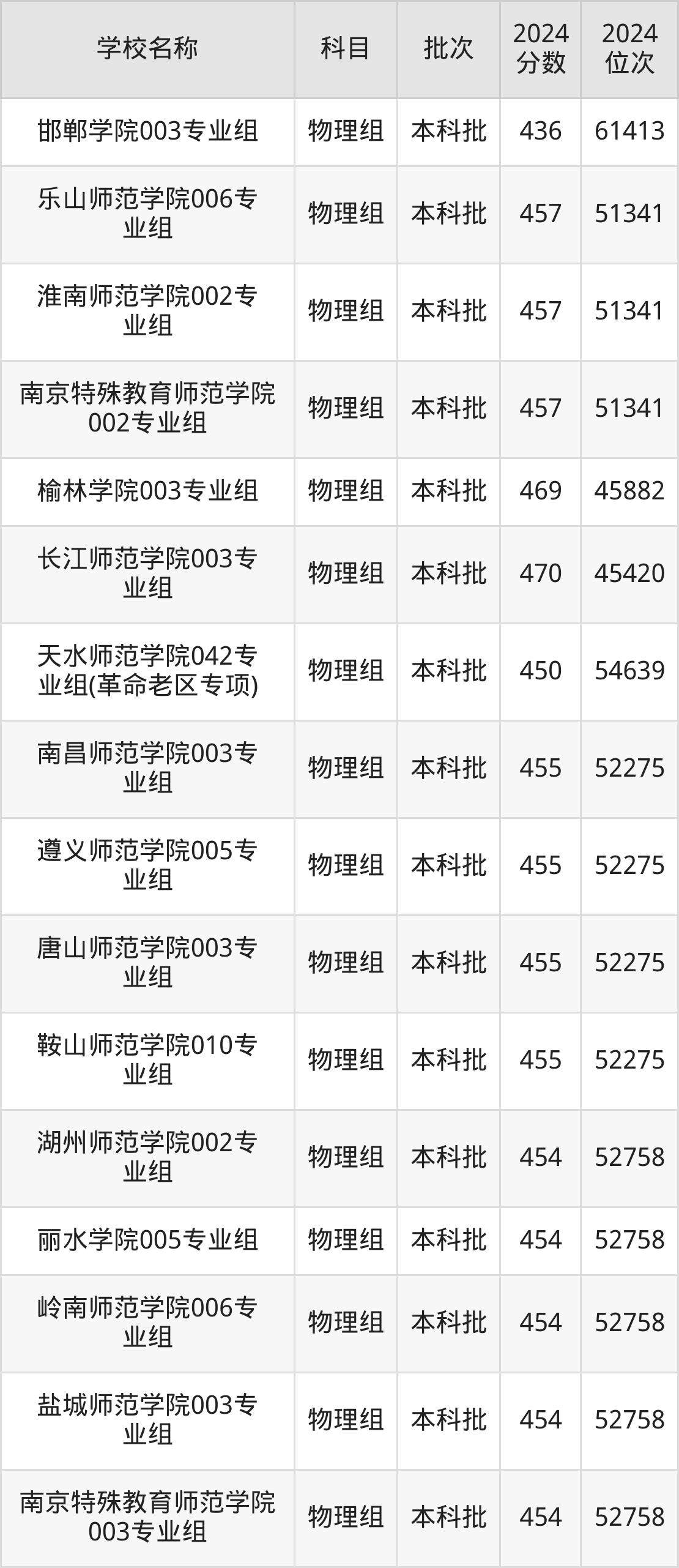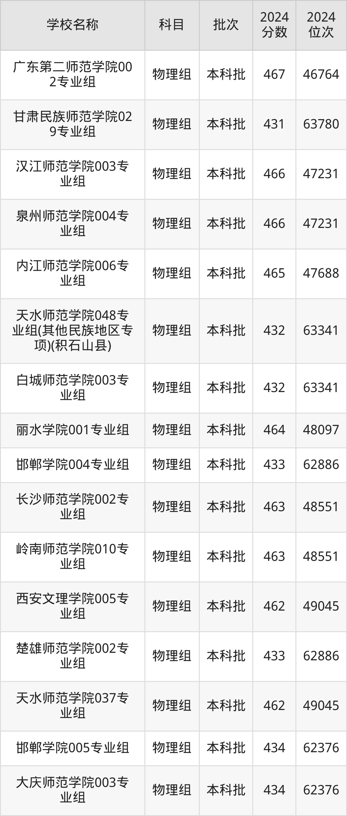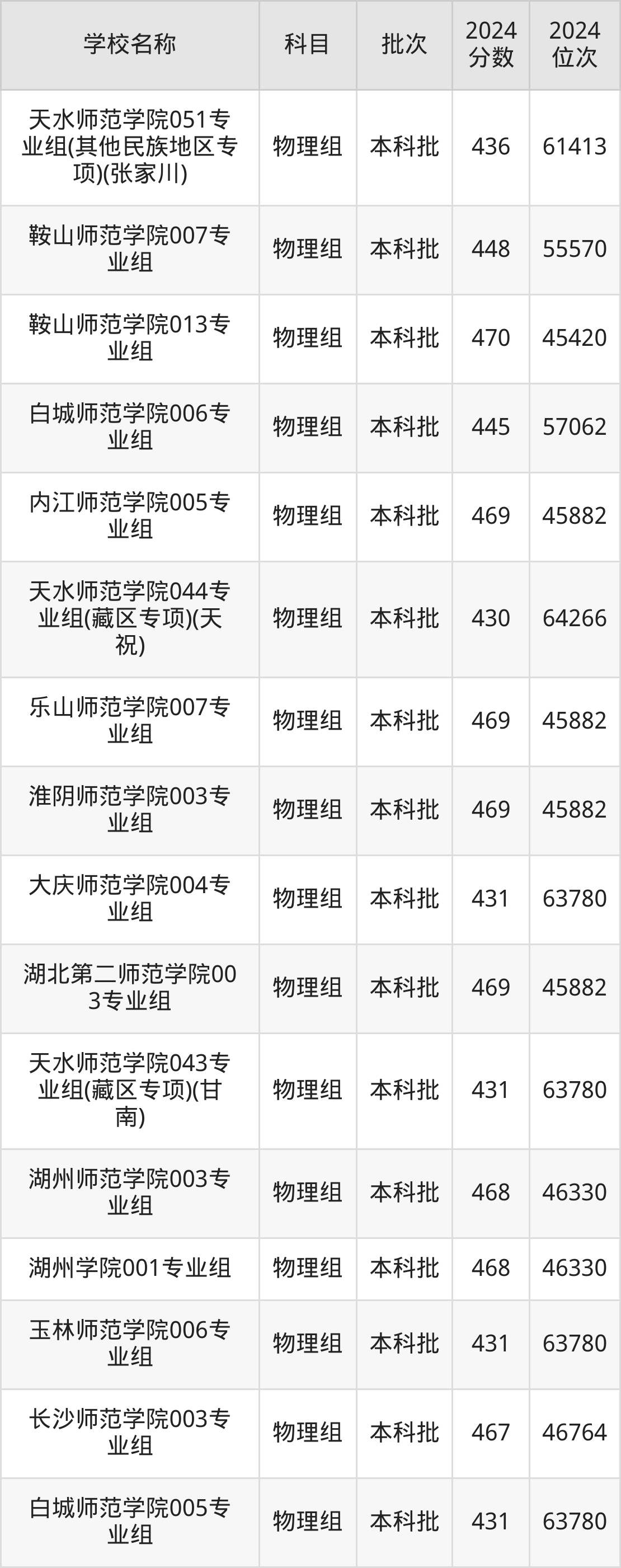 甘肃高考物理组共有44所二本师范大学在430到470分之间录取,包含长江师范学院、鞍山师范学院、榆林学院、内江师范学院、乐山师范学院、淮阴师范学院、湖北第二师范学院、湖州师范学院、湖州学院、长沙师范学院。