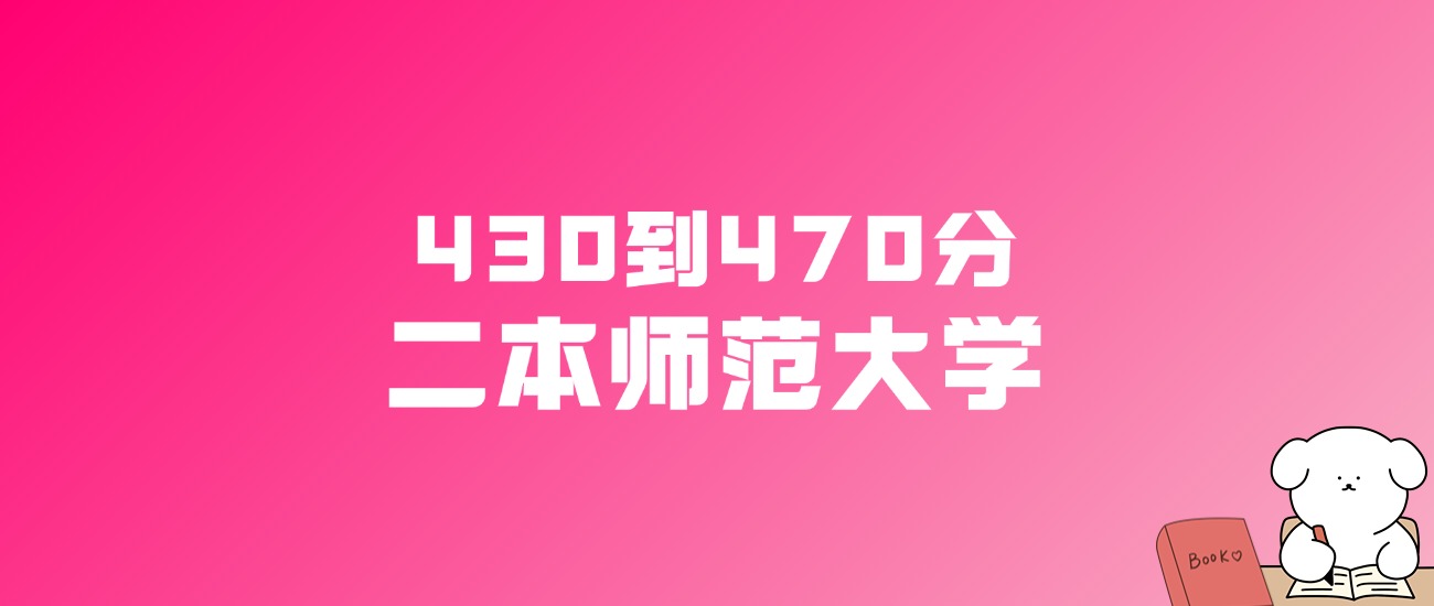430到470分的二本师范大学有吉林师范大学博达学院、汉江师范学院、韩山师范学院、白城师范学院、周口师范学院、牡丹江师范学院、玉林师范学院、鞍山师范学院、甘肃民族师范学院、阿坝师范学院等。