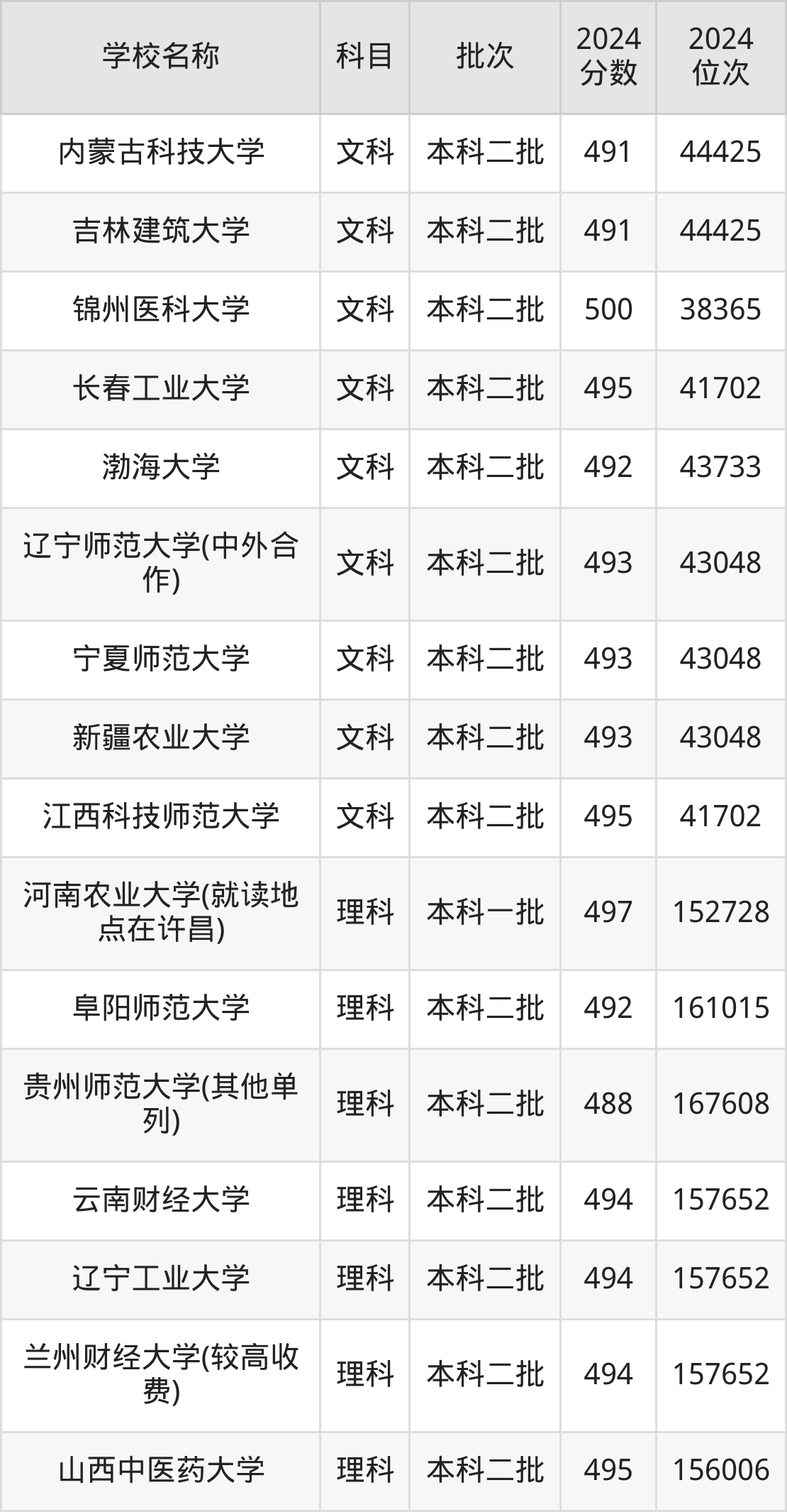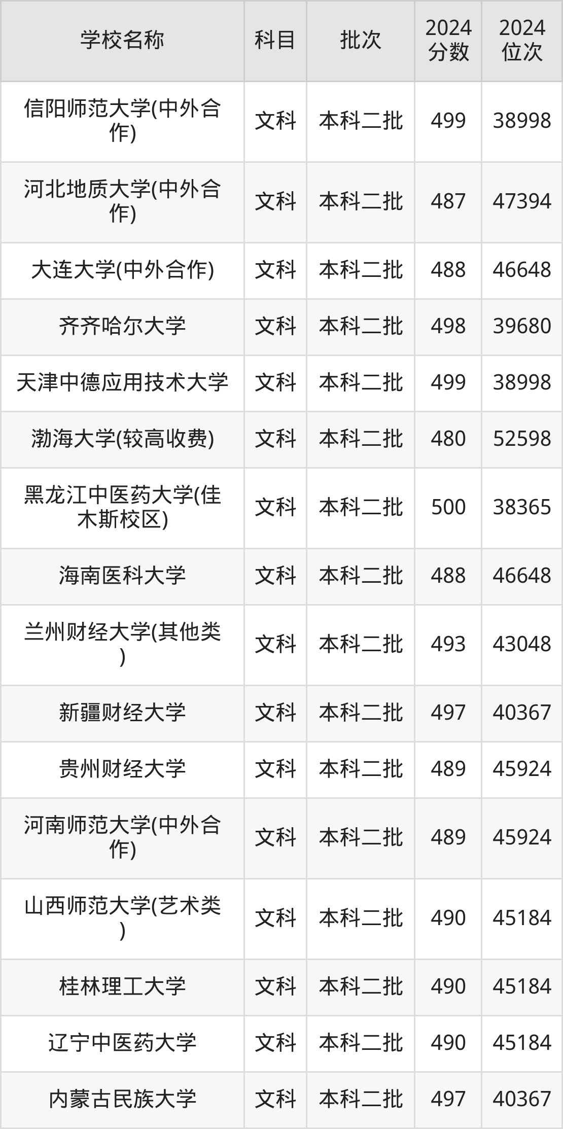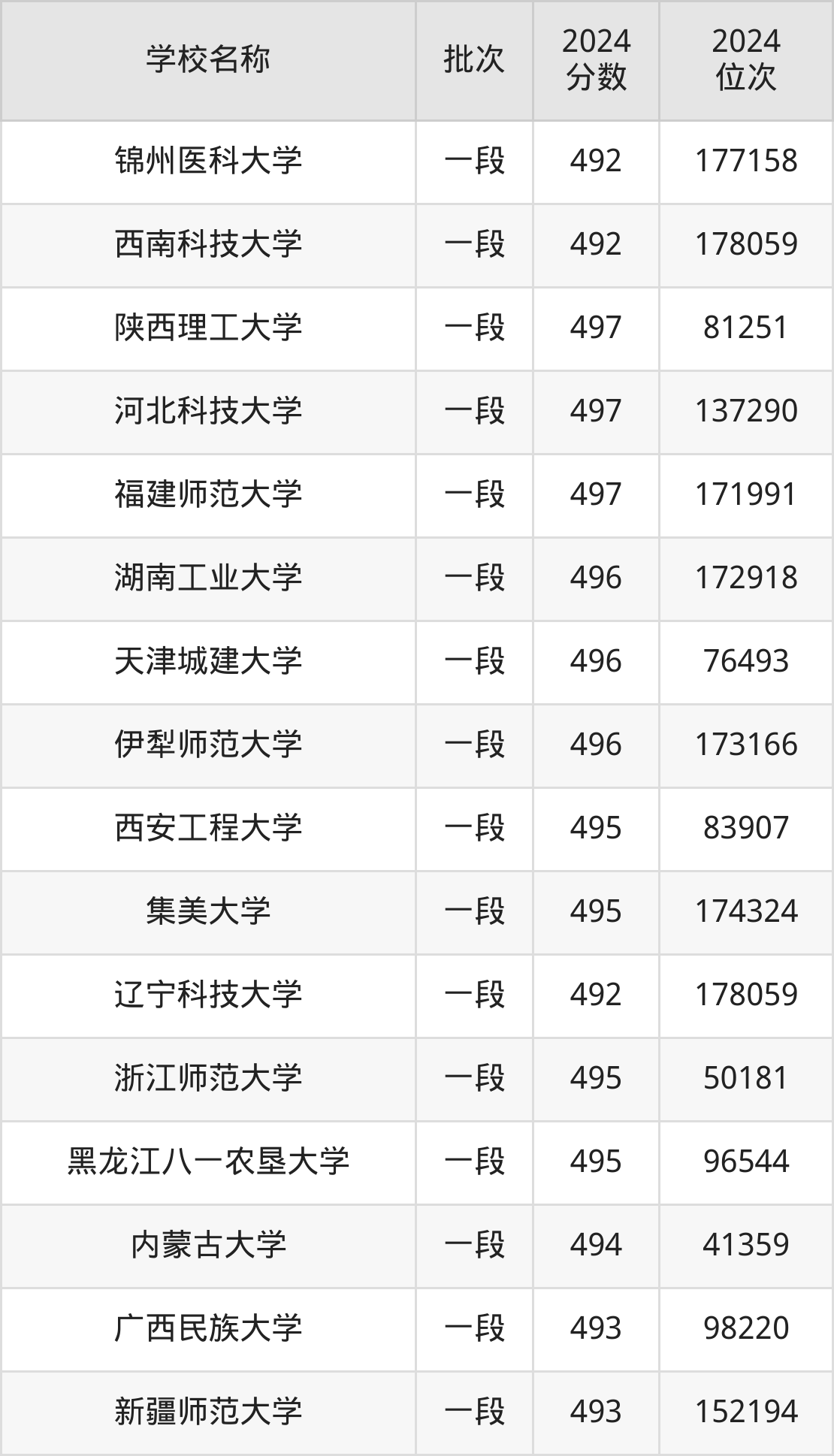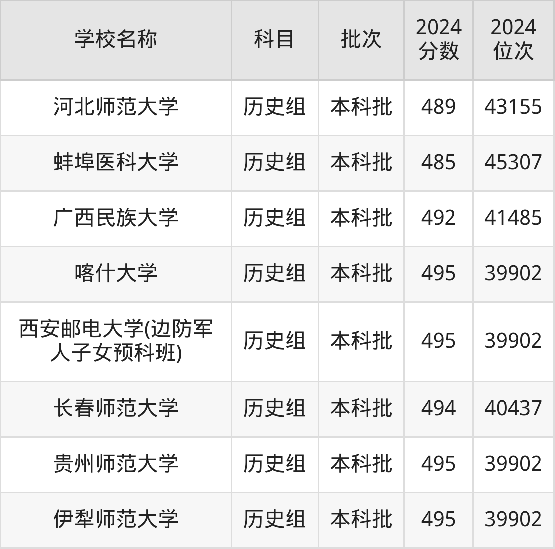 河北高考历史组共有8所一本大学在480到500分之间录取,包含伊犁师范大学、喀什大学、西安邮电大学(边防军人子女预科班)、贵州师范大学、长春师范大学、广西民族大学、河北师范大学、蚌埠医科大学。