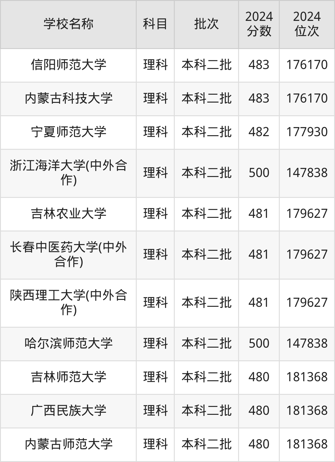 河南高考理科共有82所一本大学在480到500分之间录取,包含哈尔滨师范大学、浙江海洋大学(中外合作)、云南师范大学(中外合作)、青岛农业大学、山东第二医科大学、大连海洋大学(中外合作)、锦州医科大学(医护类)、甘肃政法大学、河北农业大学、山西农业大学。