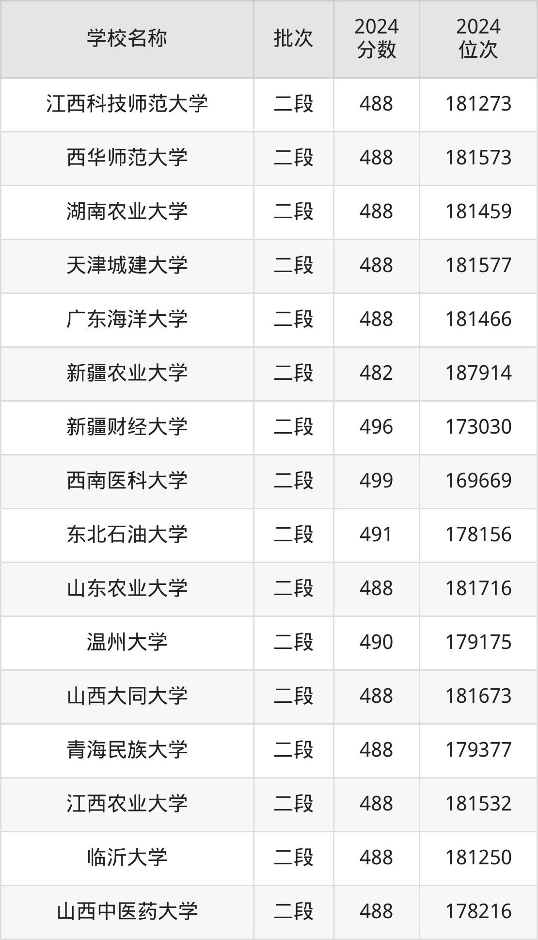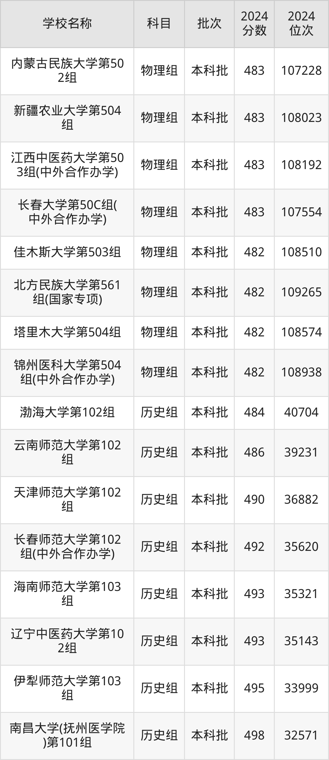 江西高考历史组共有9所一本大学在480到500分之间录取,包含新疆农业大学、南昌大学(抚州校区)、伊犁师范大学、辽宁中医药大学、海南师范大学、长春师范大学、天津师范大学、云南师范大学、渤海大学。