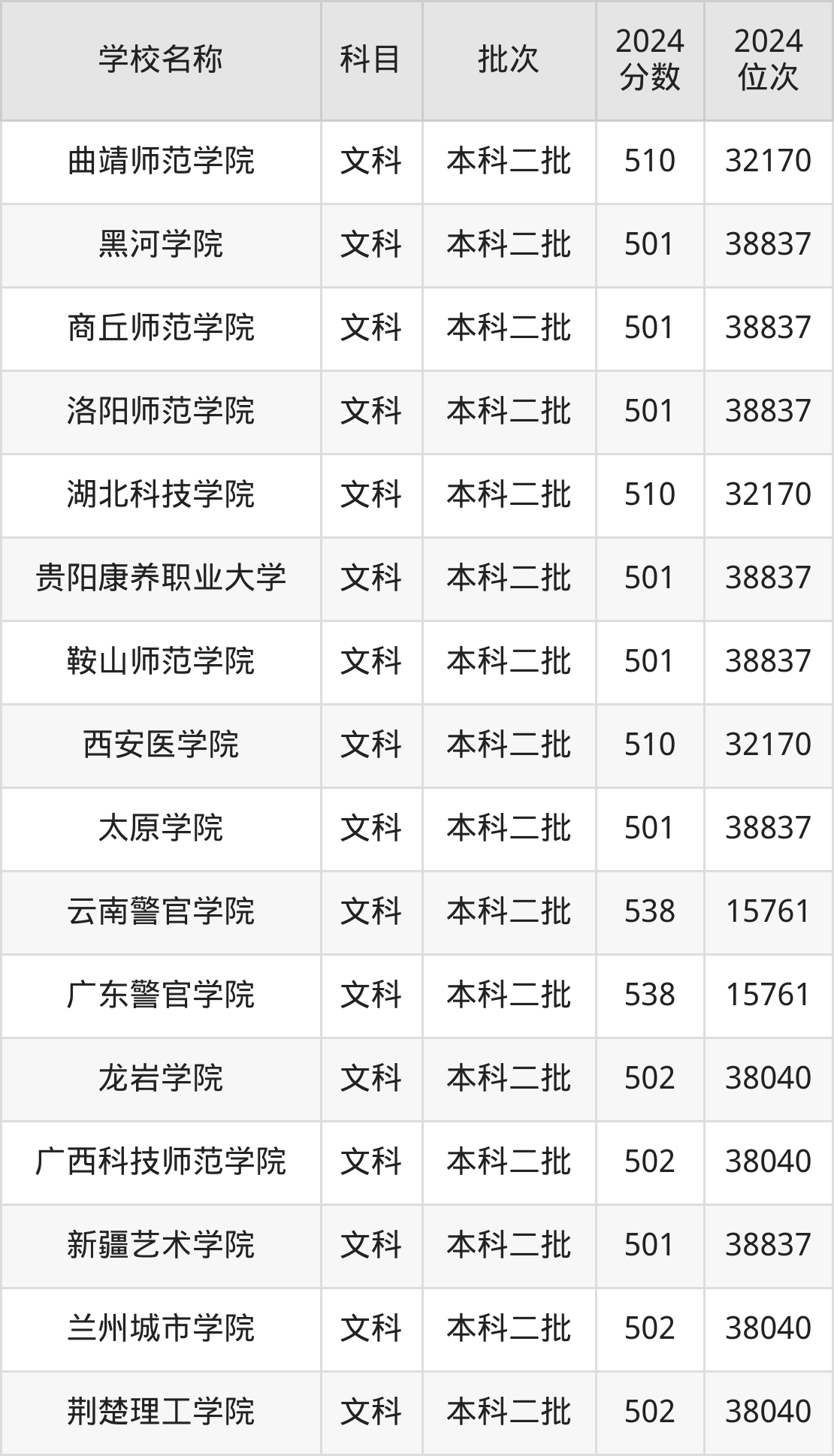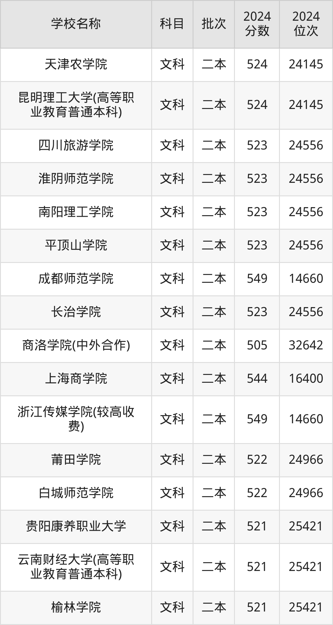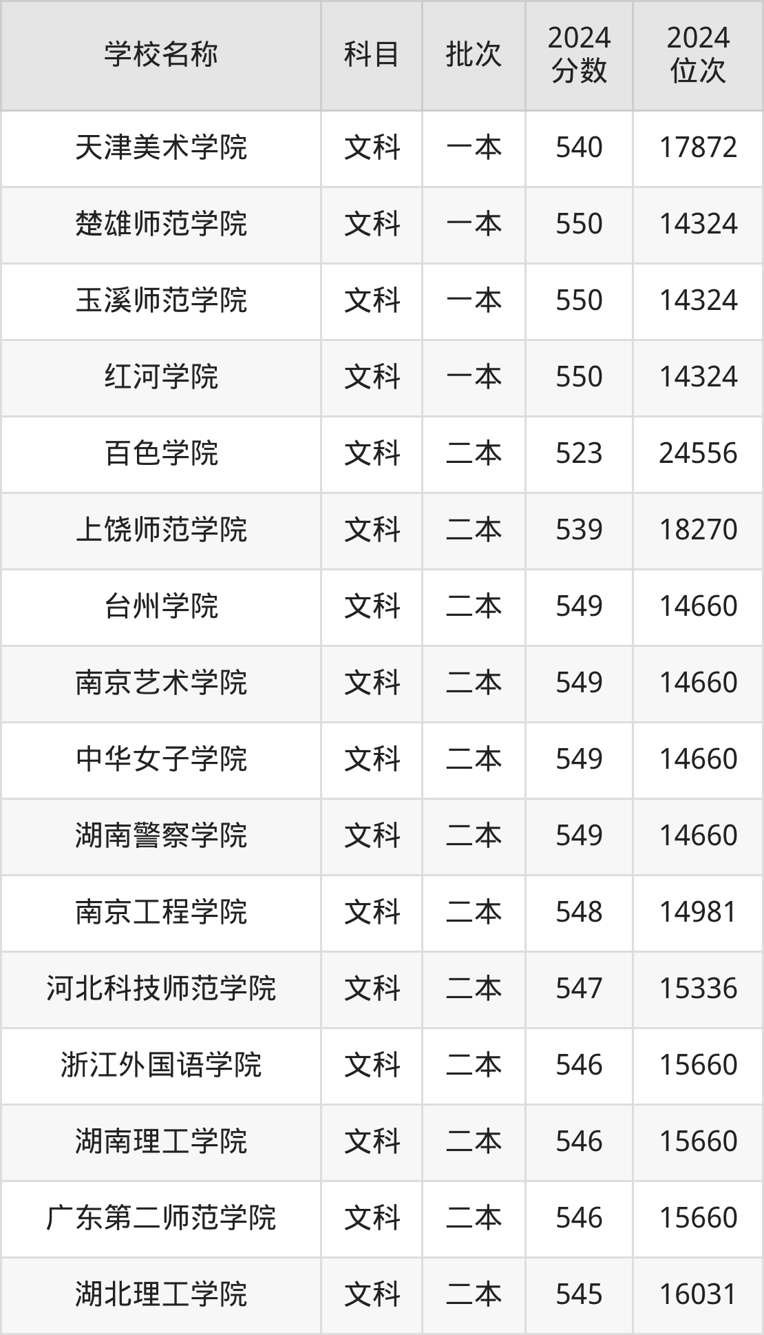 云南高考文科共有217所二本公办大学在500到550分之间录取,包含红河学院、楚雄师范学院、玉溪师范学院、成都师范学院、贵州警察学院、浙江传媒学院(较高收费)、台州学院、南京艺术学院、中华女子学院、湖南警察学院。