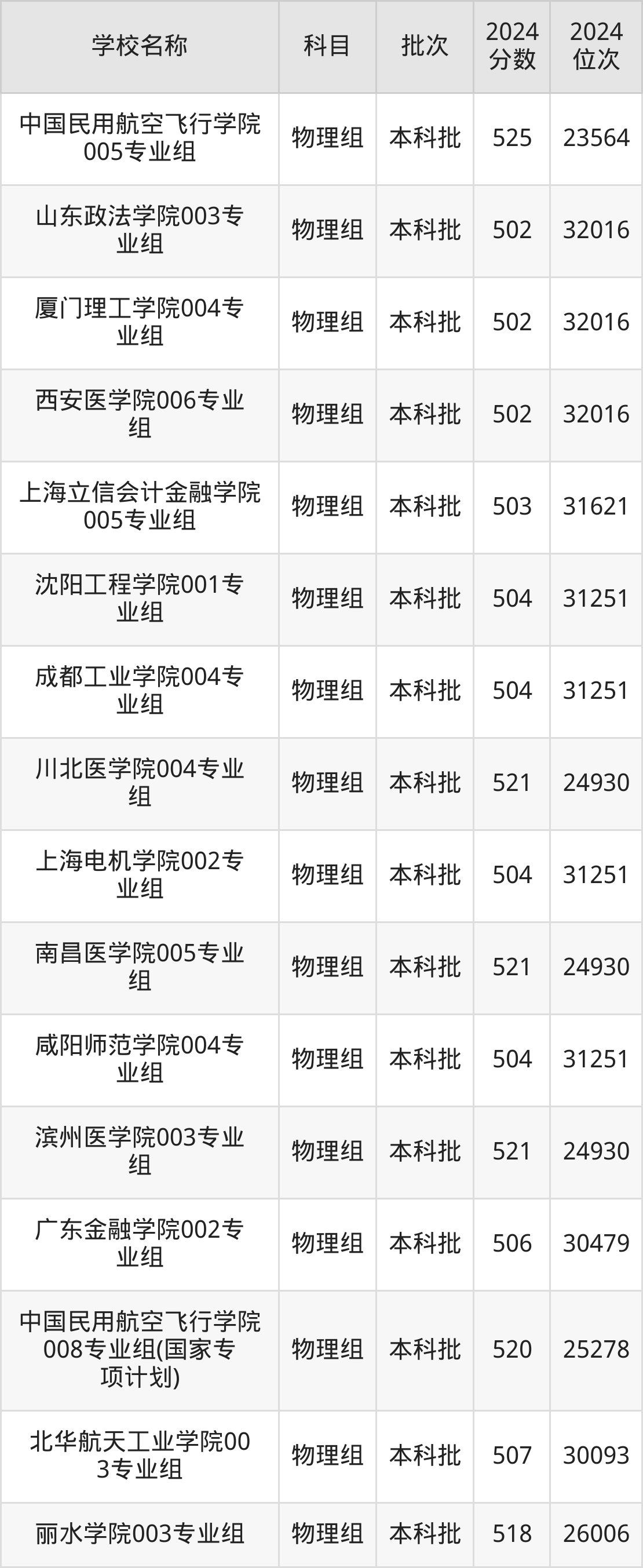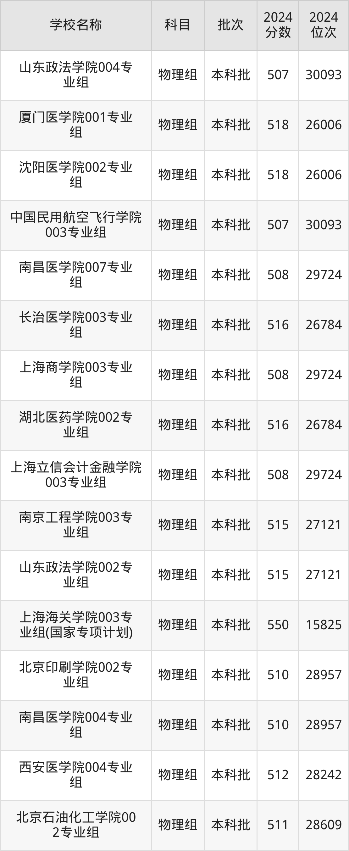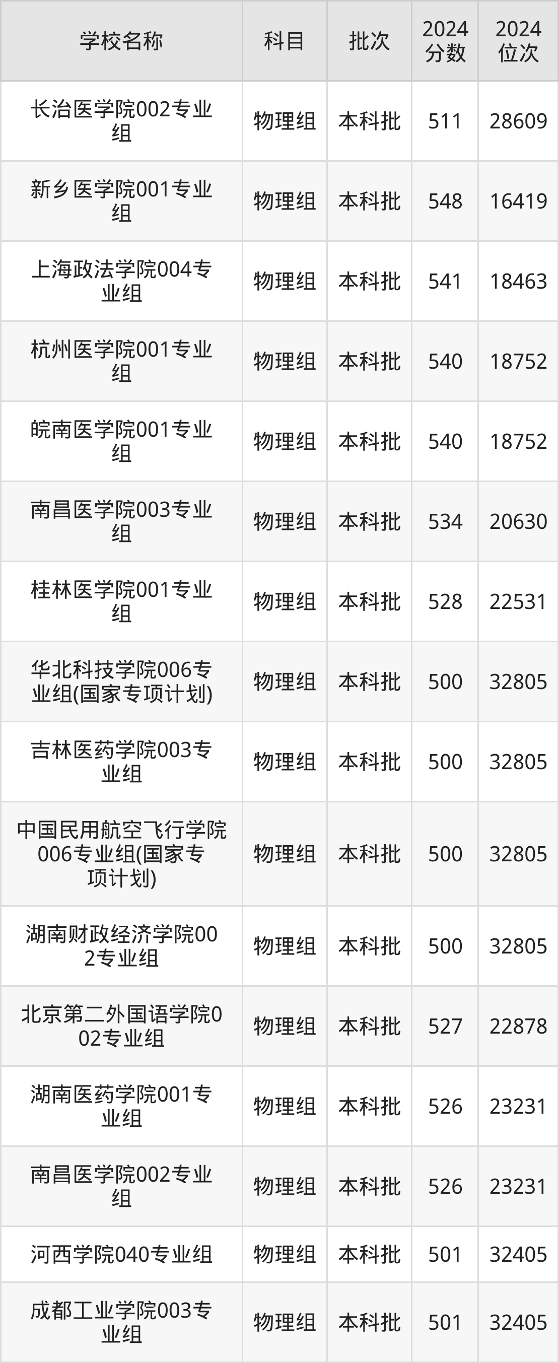 甘肃高考物理组共有35所二本公办大学在500到550分之间录取,包含上海海关学院、新乡医学院、上海政法学院、杭州医学院、皖南医学院、南昌医学院、桂林医学院、北京第二外国语学院、湖南医药学院、中国民用航空飞行学院。