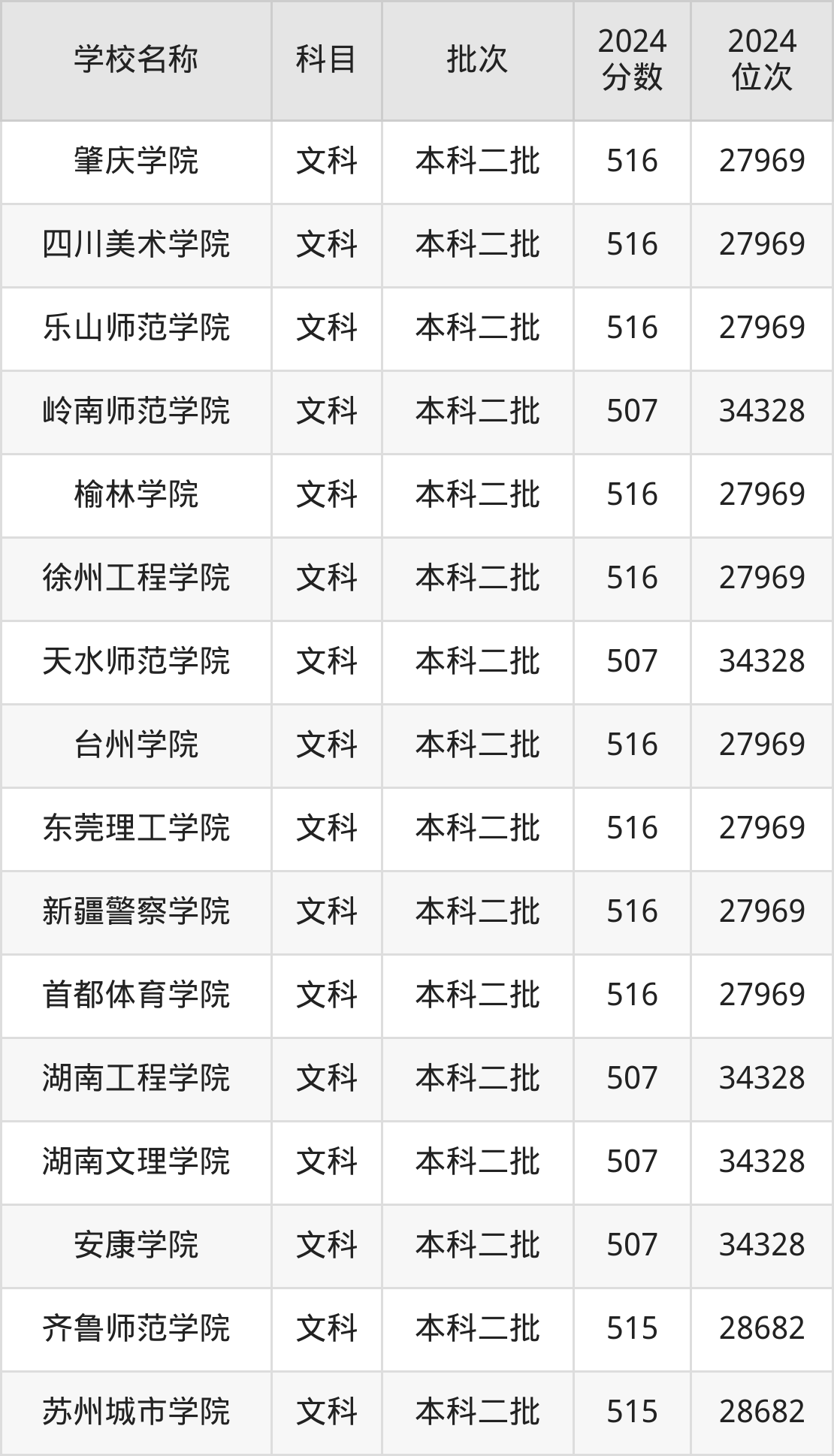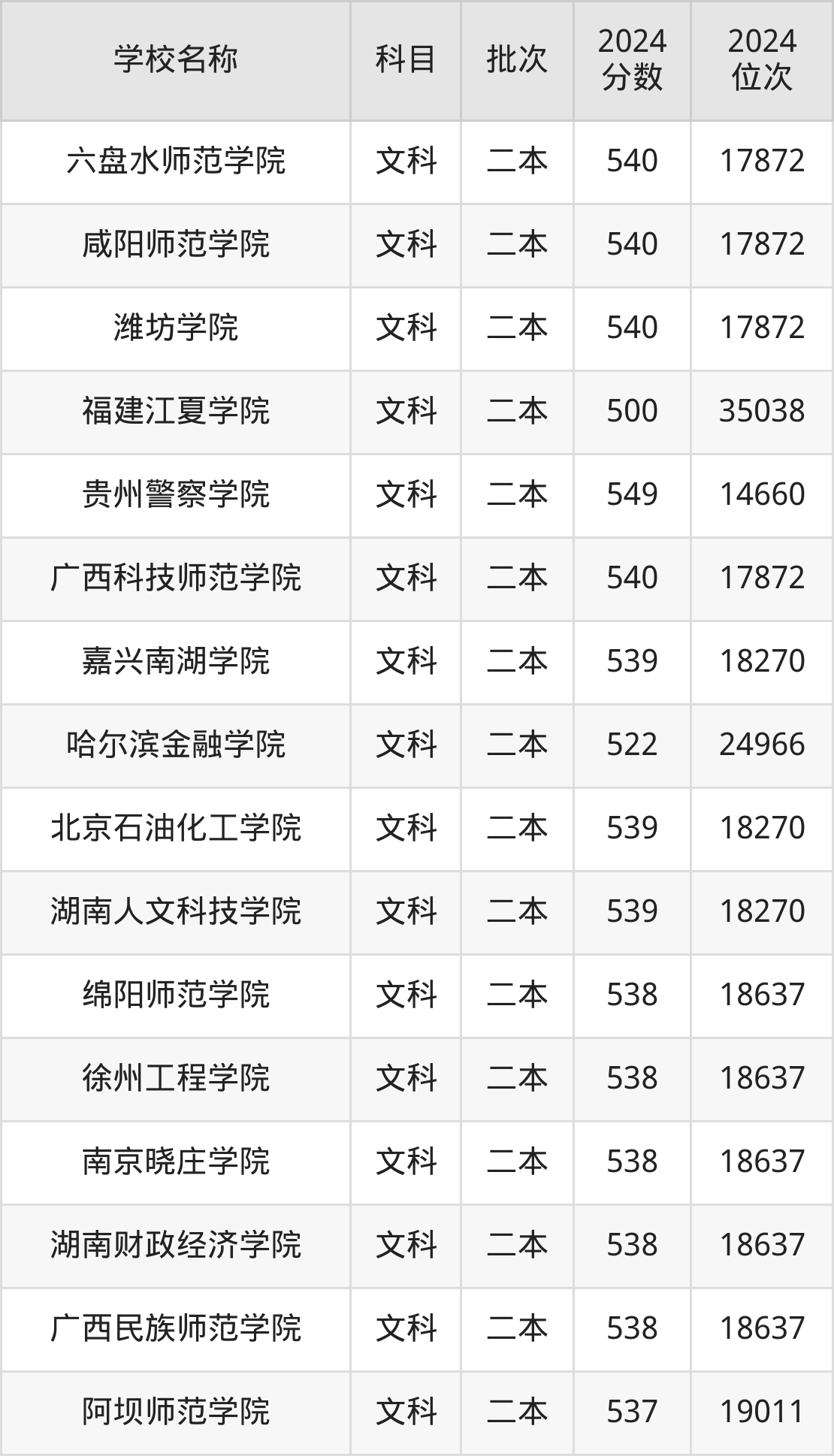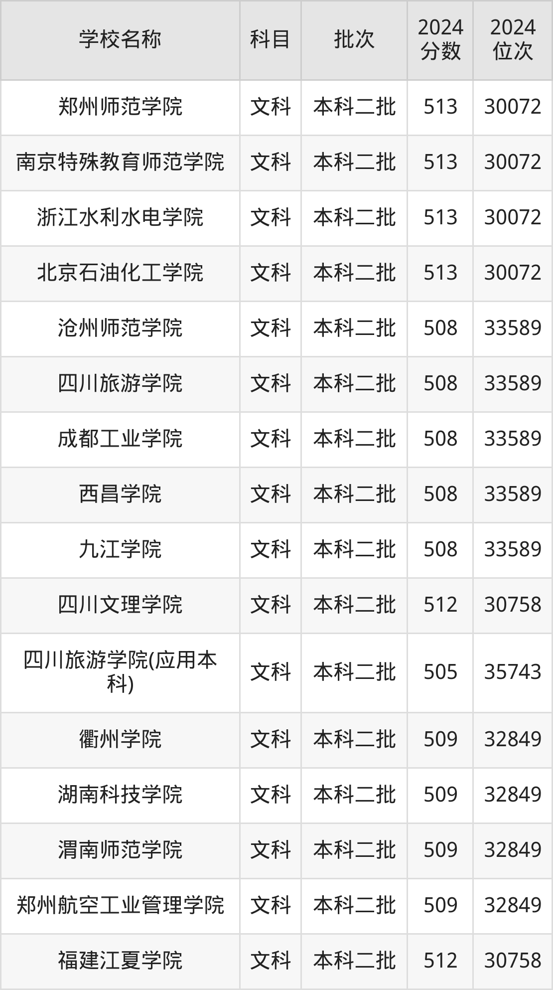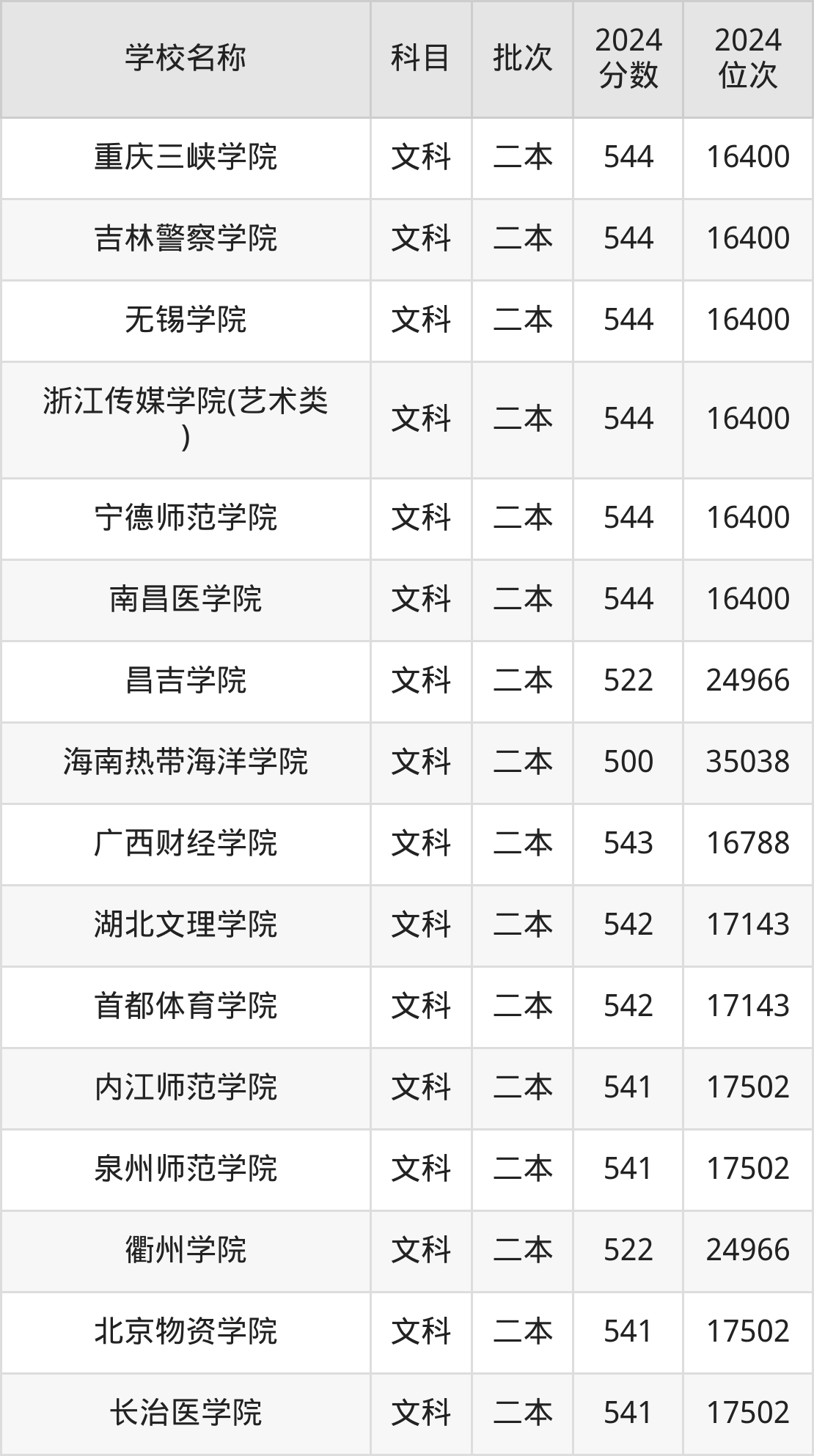 四川高考文科共有243所二本公办大学在500到550分之间录取,包含川北医学院、四川警察学院、湖州师范学院、北京舞蹈学院、云南警官学院、广东警官学院、浙江外国语学院、中国戏曲学院、浙大城市学院、成都体育学院。