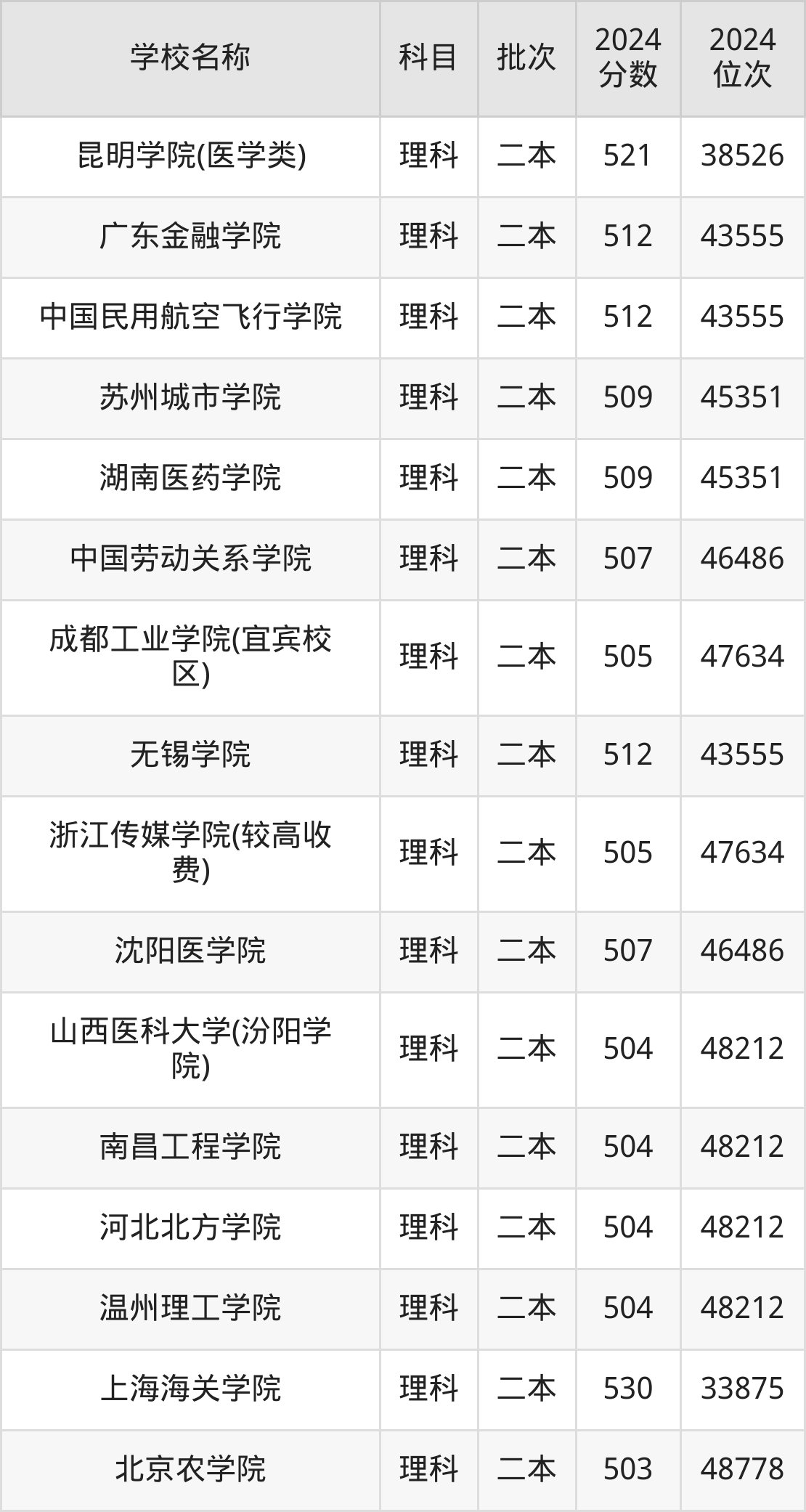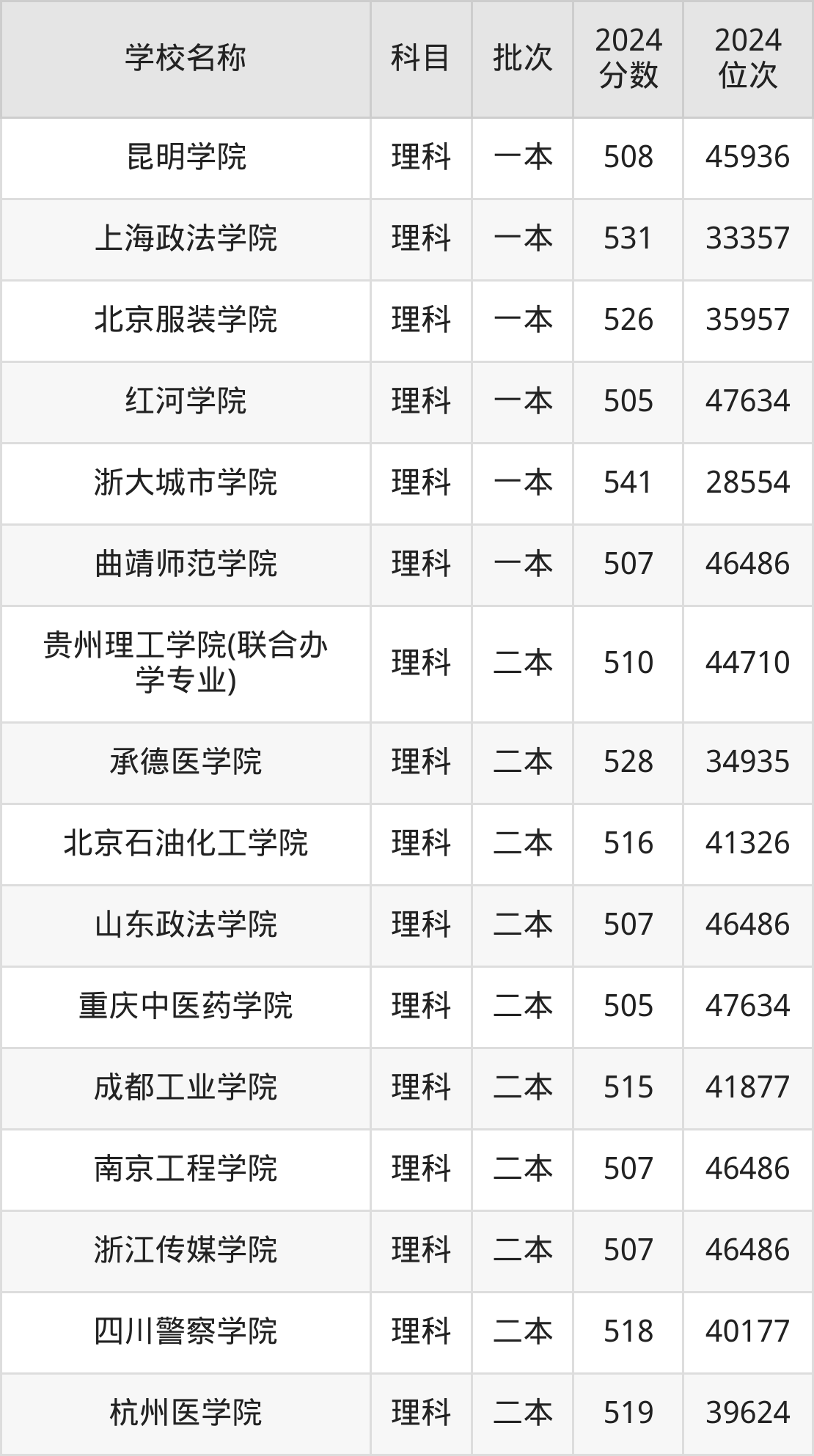 云南高考理科共有49所二本公办大学在500到550分之间录取,包含北京印刷学院、浙大城市学院、皖南医学院、川北医学院、上海政法学院、上海海关学院、承德医学院、北京服装学院、昆明学院(医学类)、杭州医学院。