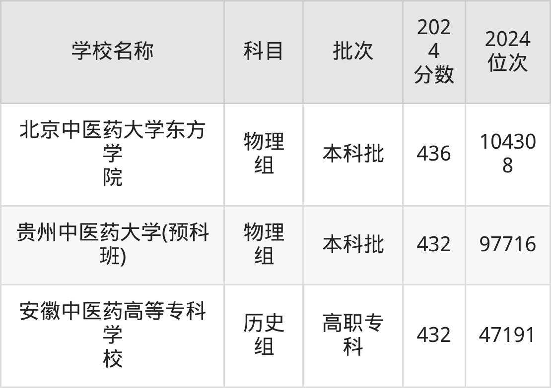 贵州高考历史组共有1所中医药大学在430到440分之间录取,包含安徽中医药高等专科学校。
