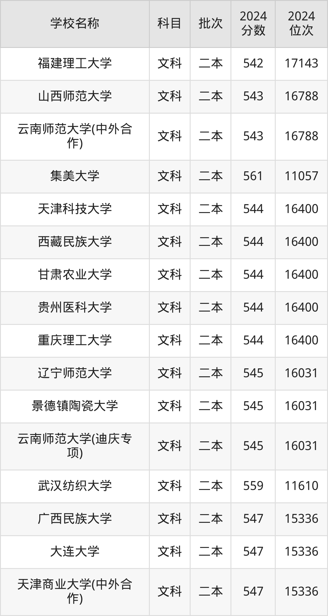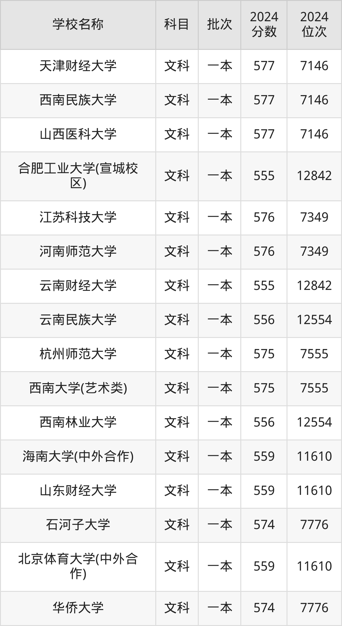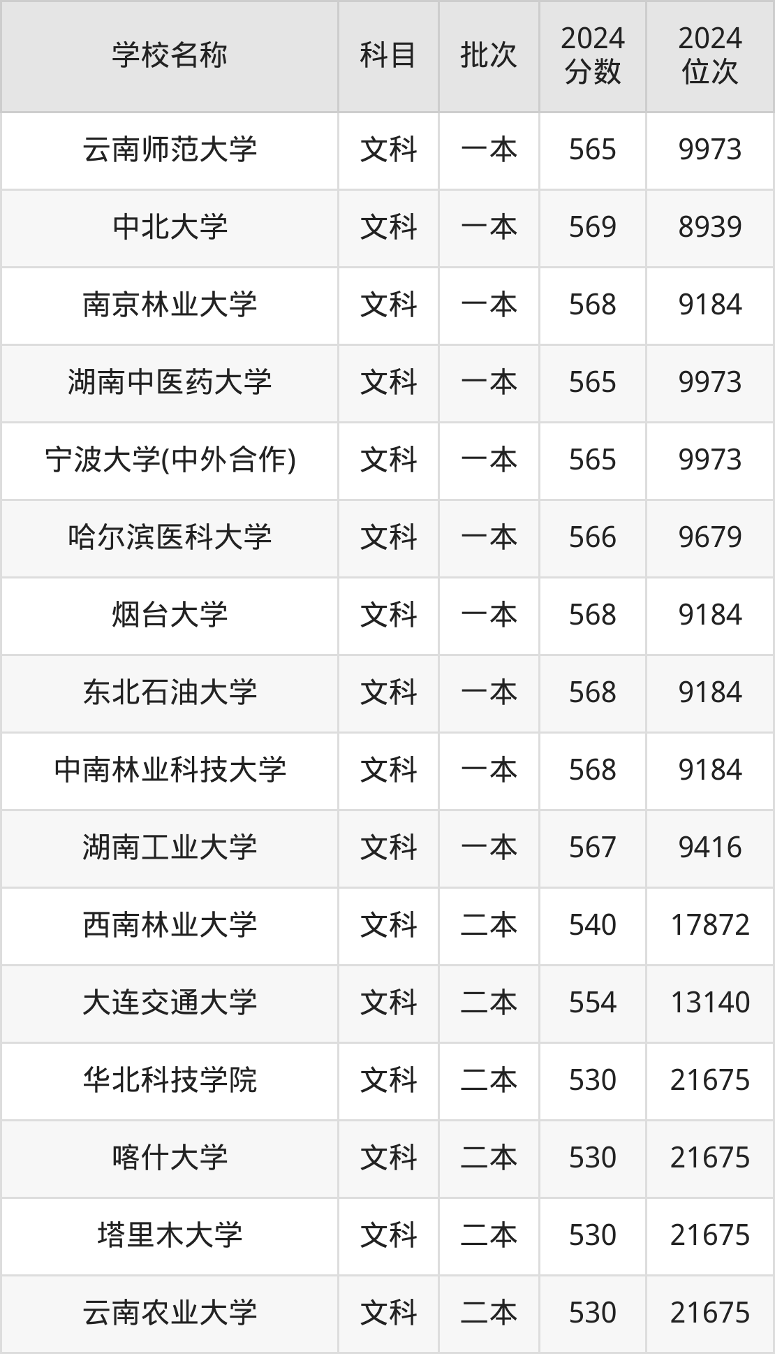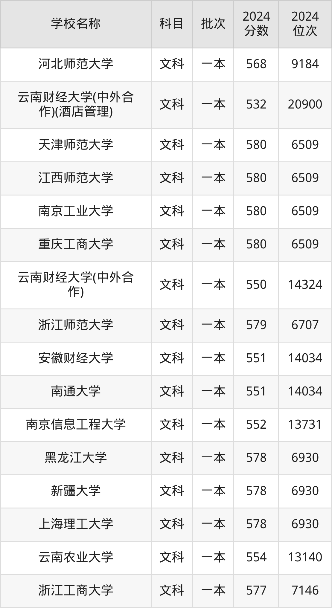 云南高考文科共有137所重点大学在530到580分之间录取,包含天津师范大学、江西师范大学、南京工业大学、重庆工商大学、浙江师范大学、黑龙江大学、新疆大学、上海理工大学、浙江工商大学、天津财经大学。