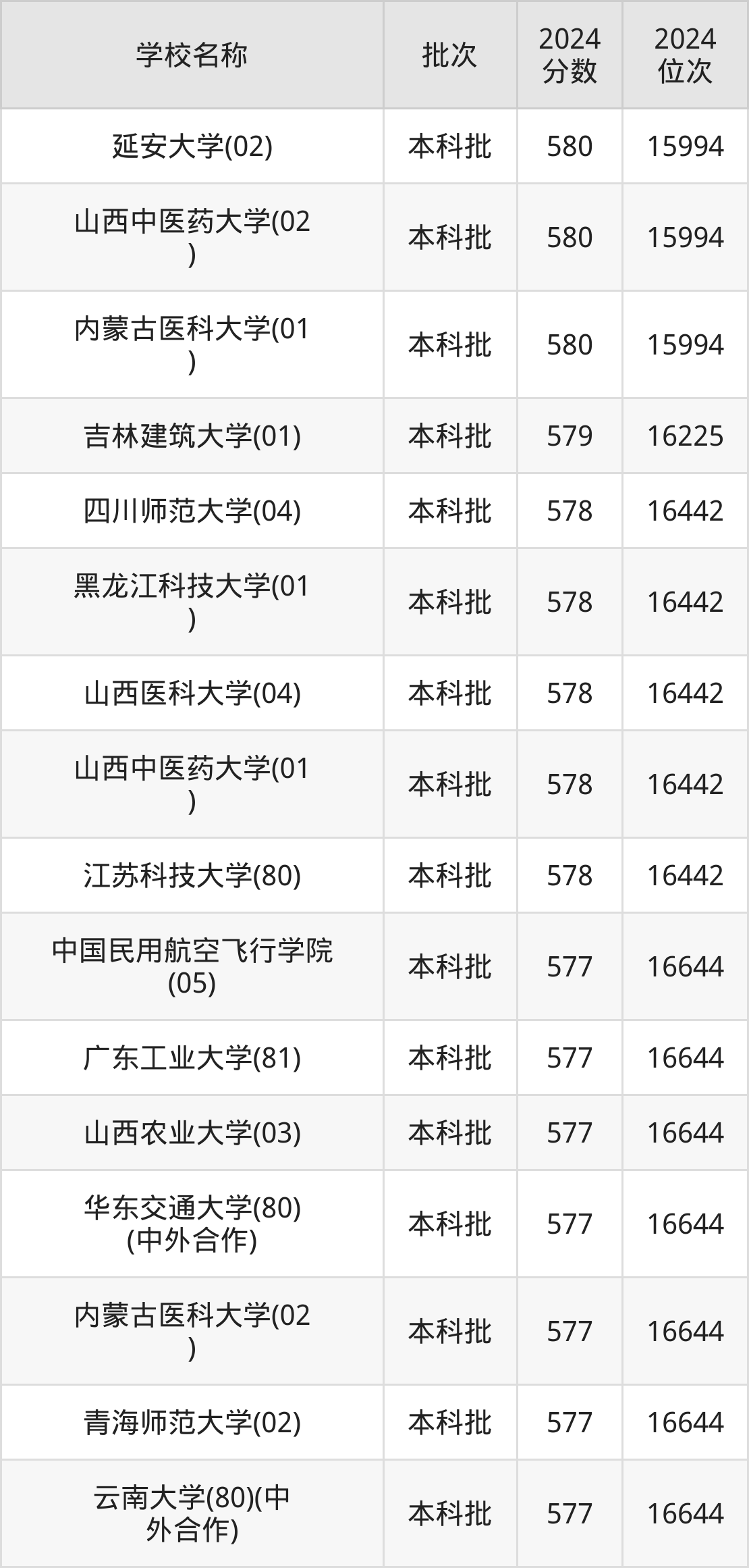 530到580分的重点大学有延安大学、山西中医药大学、内蒙古医科大学、吉林建筑大学、四川师范大学、黑龙江科技大学、山西医科大学、江苏科技大学、中国民用航空飞行学院、广东工业大学等。
