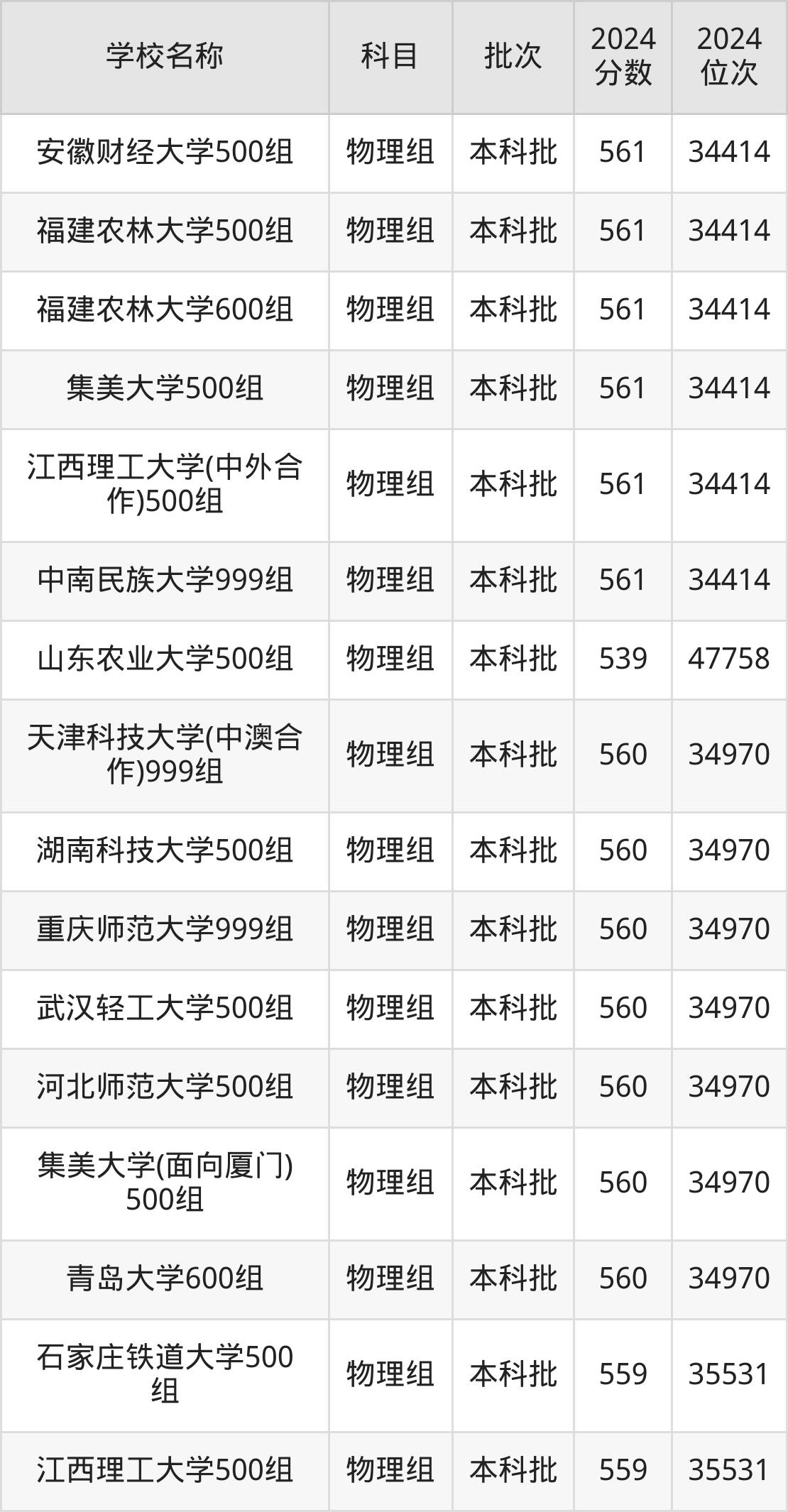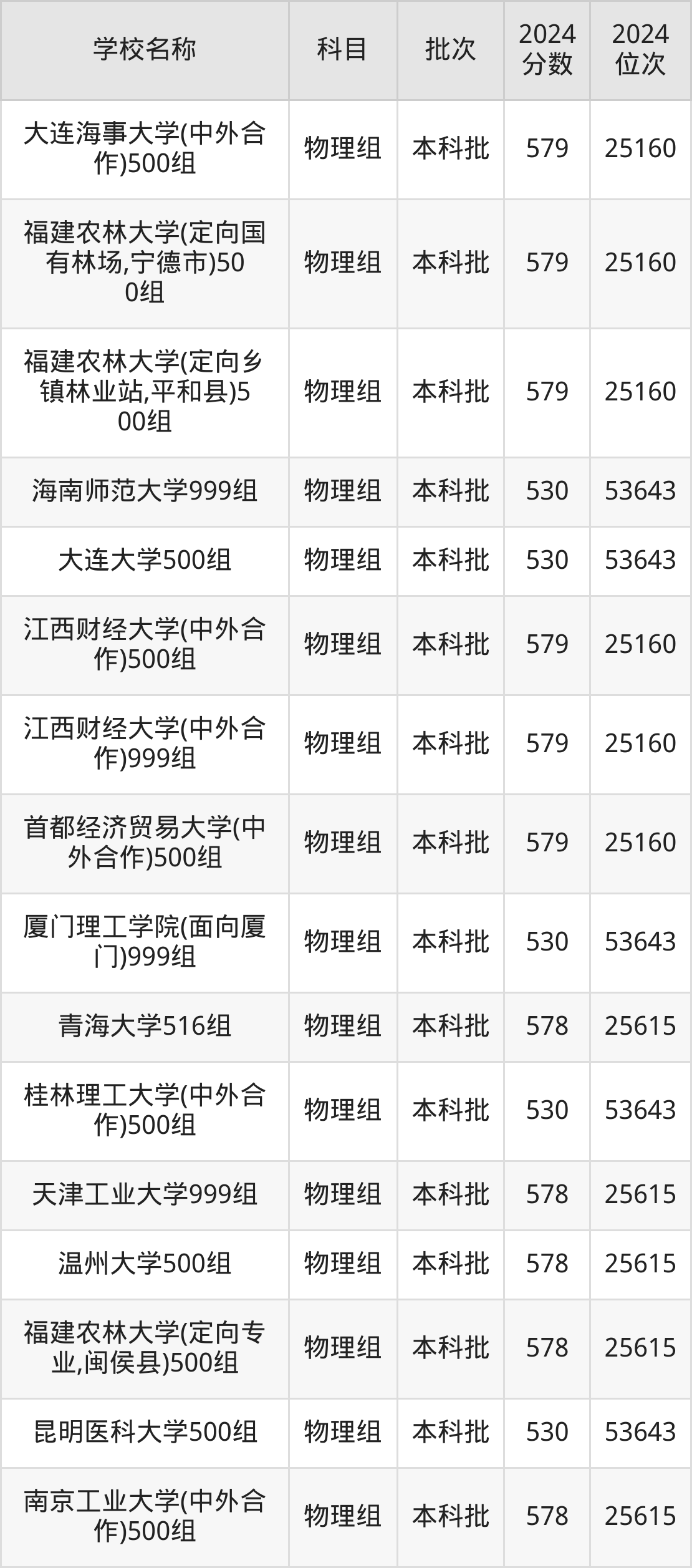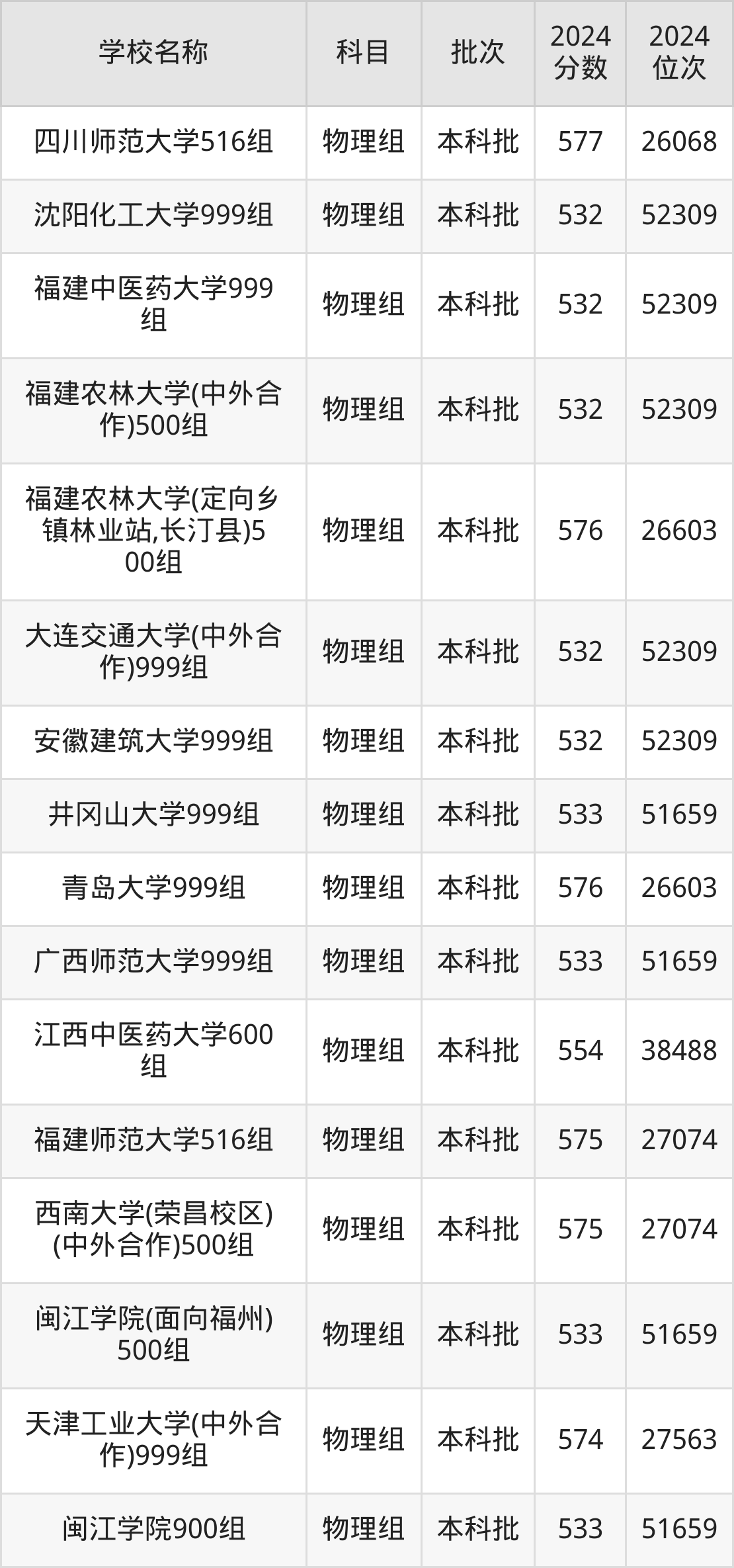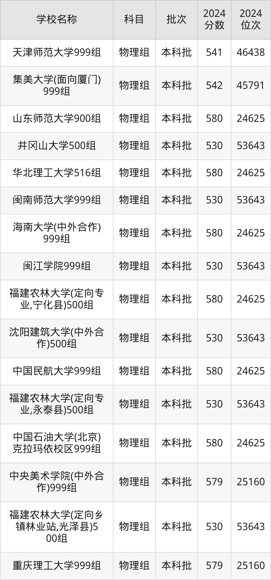 福建高考物理组共有269所重点大学在530到580分之间录取,包含三峡大学、山东师范大学、华北理工大学、海南大学(中外合作)、福建农林大学(定向专业,宁化县)、中国民航大学、中国石油大学(北京)克拉玛依校区、中央美术学院(中外合作)、重庆理工大学、大连海事大学(中外合作)。