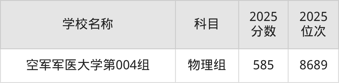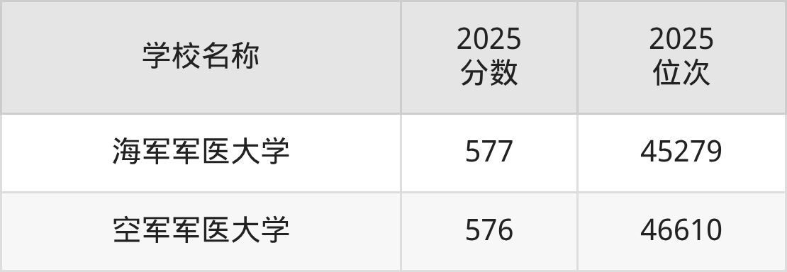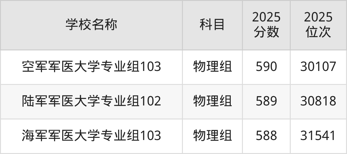 四川高考物理组共有3所军校在570到590分之间录取,包含空军军医大学、陆军军医大学、海军军医大学。