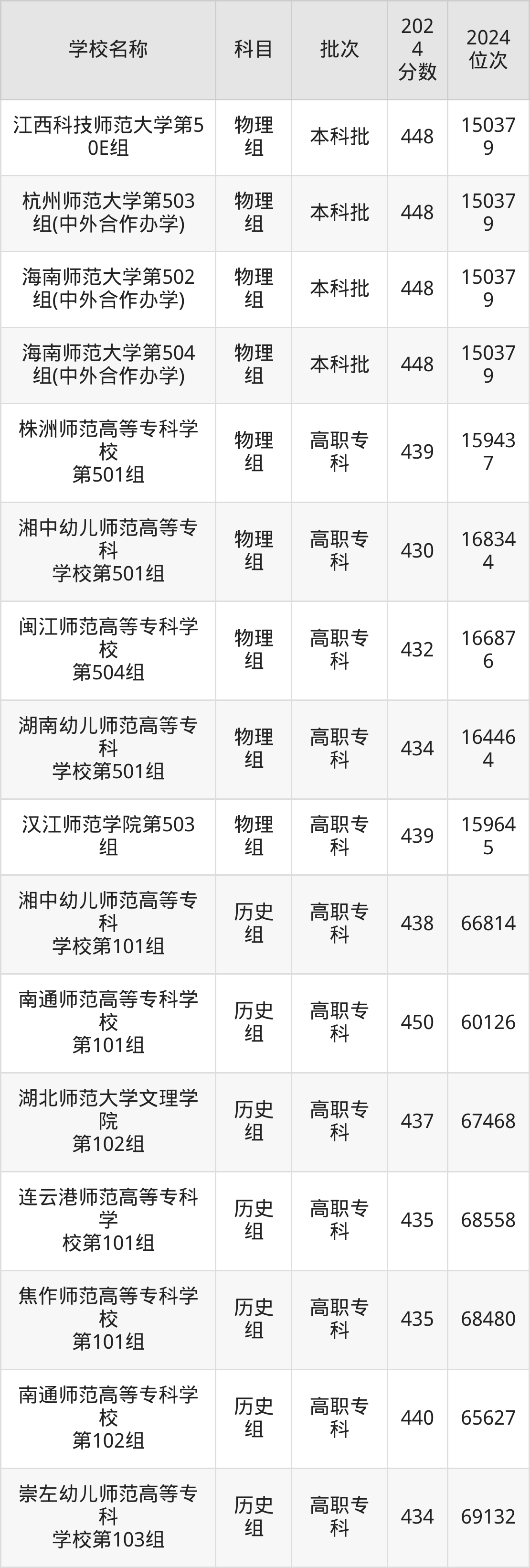 江西高考物理组共有8所师范大学在430到450分之间录取,包含江西科技师范大学、杭州师范大学、海南师范大学、汉江师范学院、株洲师范高等专科学校、湖南幼儿师范高等专科学校、闽江师范高等专科学校、湘中幼儿师范高等专科学校。