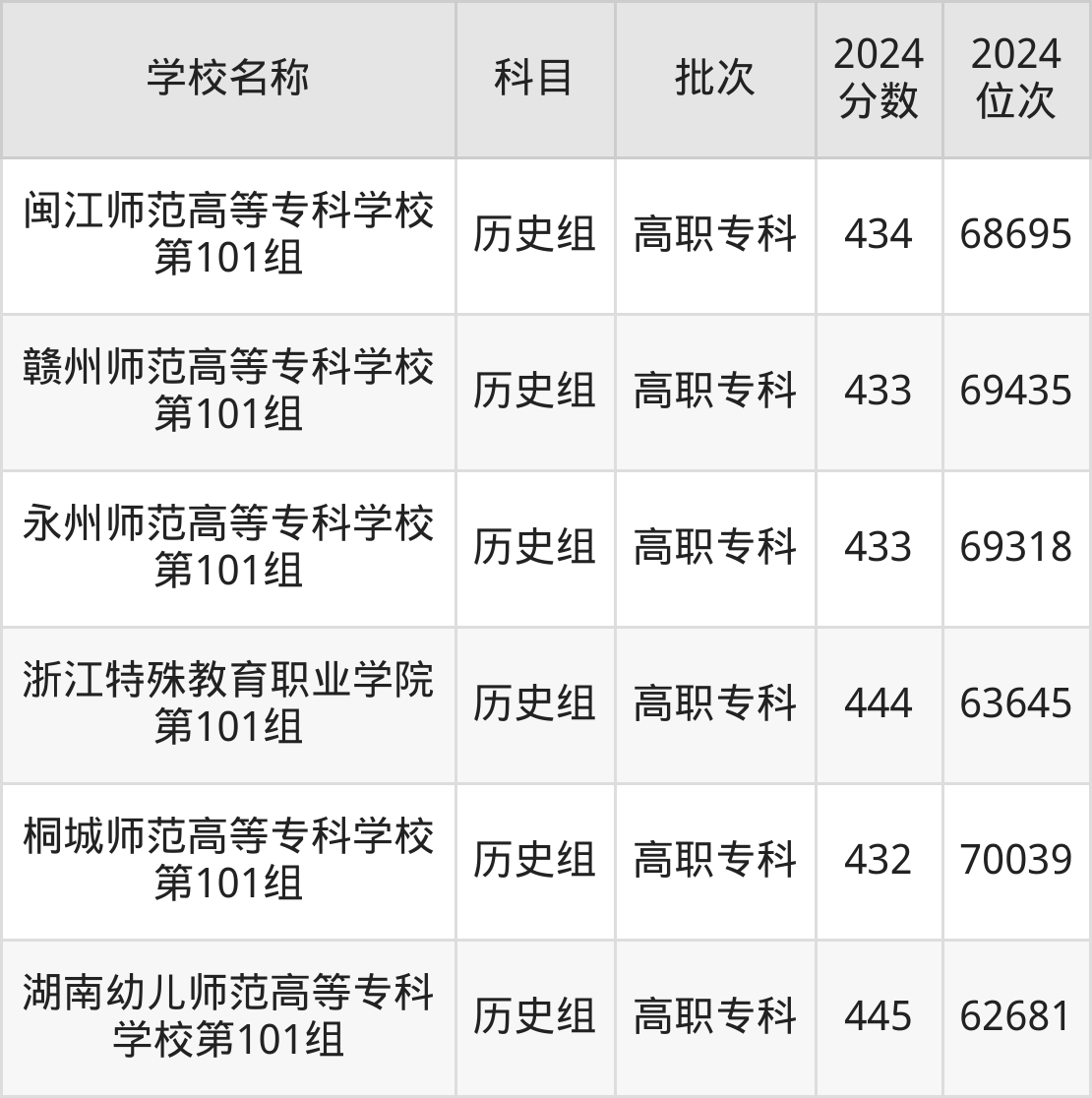 江西高考历史组共有12所师范大学在430到450分之间录取,包含南通师范高等专科学校、湖南幼儿师范高等专科学校、浙江特殊教育职业学院、湘中幼儿师范高等专科学校、湖北师范大学文理学院、连云港师范高等专科学校、焦作师范高等专科学校、崇左幼儿师范高等专科学校、闽江师范高等专科学校、赣州师范高等专科学校。
